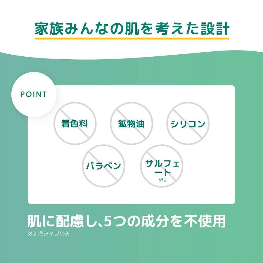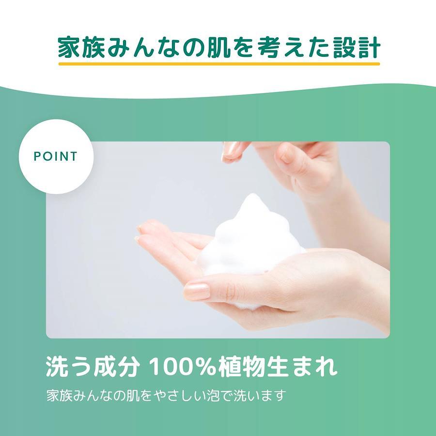 【洗う成分100%植物生まれ】家族みんなの肌をやさしい泡で洗いあげます。モコモコの泡で洗えて、家族みんなの肌にちょうどいいサッパリ。【素肌すこやか成分*配合】肌のアミノ酸を守り、うるおいをキープしながら洗えます。*アセチルグルコサミン、DPG【こどものデリケートな肌にもやさしい】肌に配慮し、4つの成分(着色料、鉱物油、シリコン、パラベン)を不使用。【肌のキメを整え、すべすべ素肌に】アロエエキス(うるおい成分)、ゲットウ葉エキス&グリセリン(整肌成分)配合。【香り】グリーンフローラルの香り。