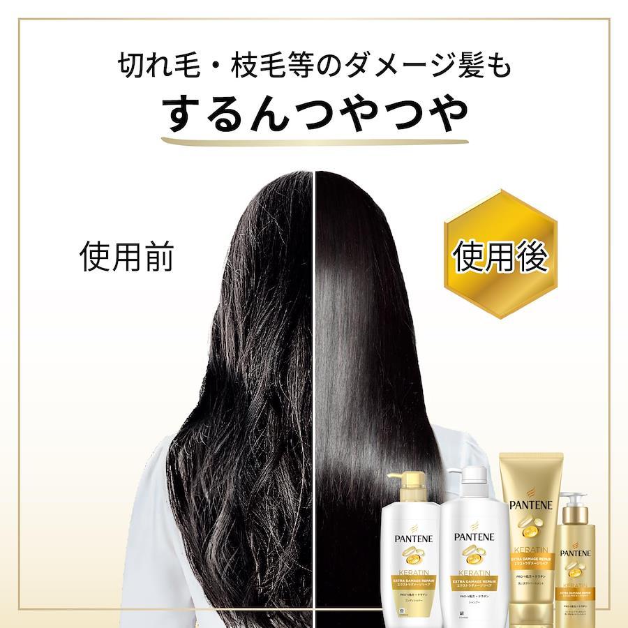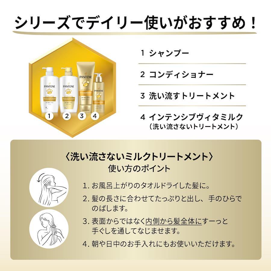 パンテーン エクストラダメージリペア インテンシブ ヴィタミルク(125mL) ケラチン*配合 洗い流さないトリートメント:切れ毛・枝毛等のダメージ髪もするんつやつや 翌朝も、広がらずにまとまる髪へ切れ毛・枝毛等のダメージ髪もするんつやつや 翌朝も、広がらずにまとまる髪へ髪のケラチンが不足すると、切れ毛になりやすく、くすんだダメージ髪に。 エクストラダメージリペアシリーズは、髪をなめらかにし、切れ毛を防ぎます。ふんわり甘い花々に爽やかな果実を散りばめた香り*加水分解ケラチン(コンディショニング成分)