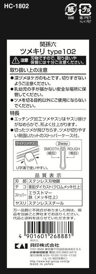 〇商品仕様関孫六 ツメキリtype102×6点セット単品サイズ50×140×25(mm)容量1本(出典:貝印)