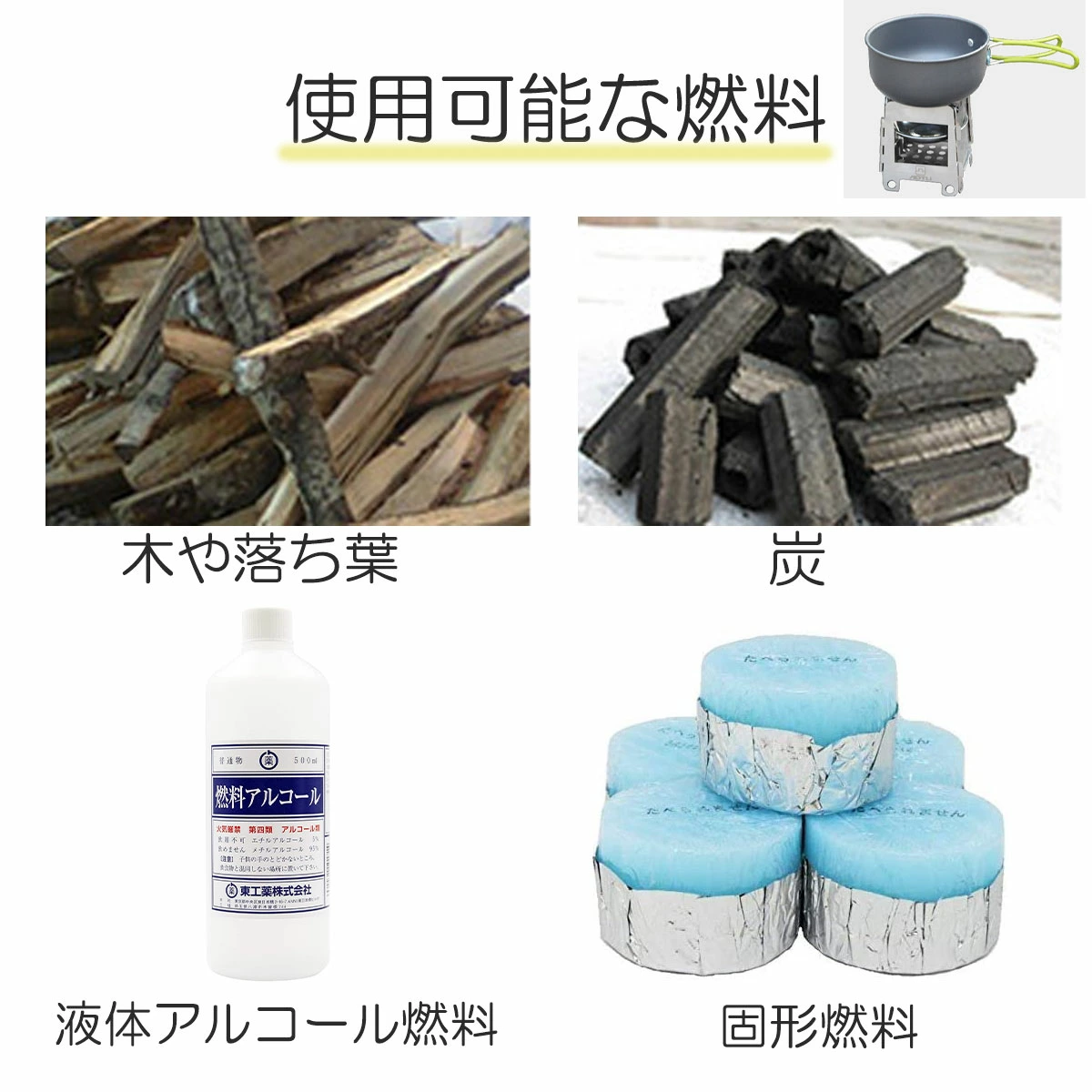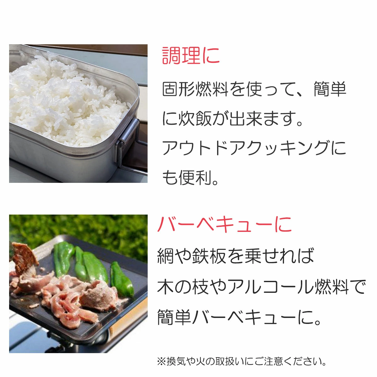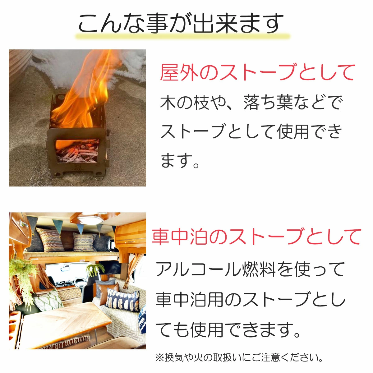 燃焼源は周辺で拾った枯れ葉や小枝、薪等、身近な素材で焚き火や調理をお楽しみいただけます。