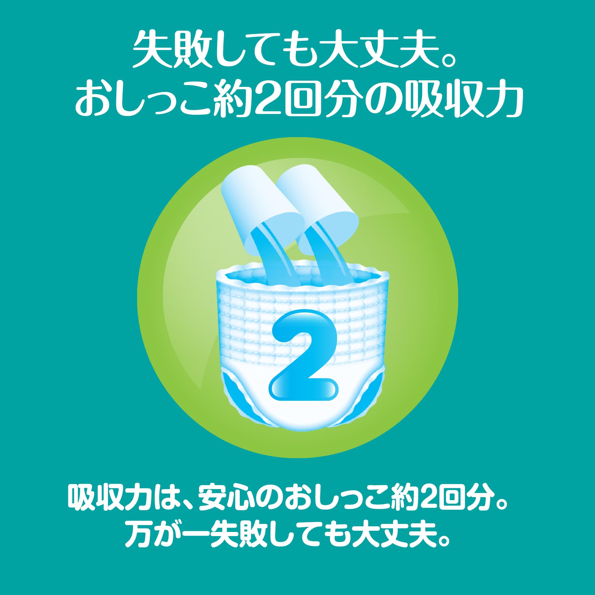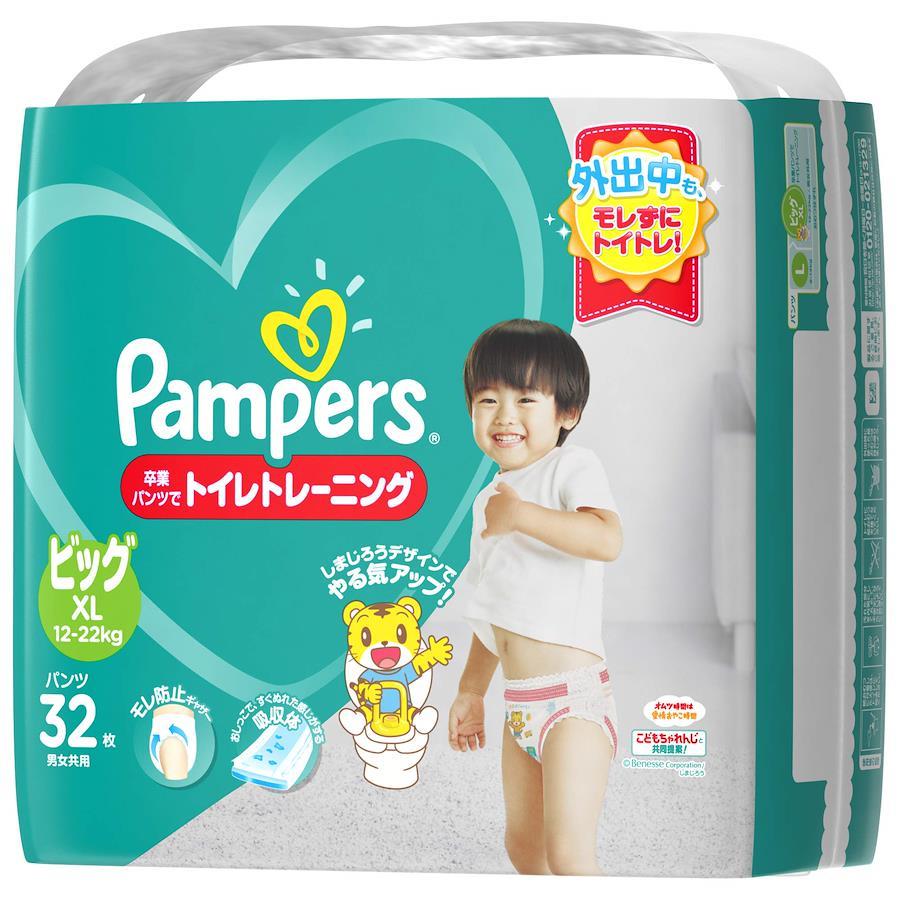 パンパース オムツ 卒業パンツ ビッグ 。 トイトレにオススメのおむつです。 ぬれた感じがするシートでおしっこに自分で気づくきっかけをつくります。 吸収力は、安心のおしっこ3回分。万が一、失敗しても大丈夫。 もちろんパンパースだから、お肌にやさしい紙オムツ。 便利なおしっこお知らせサインつき。 テープが付いている方がうしろです 商品サイズ (幅×奥行×高さ) :200mm×80mm×325mm 原産国:日本 内容量:32枚 材質:表面材: ポリオレフィン不織布<br>吸収材: ポリエステル不織布、ポリオレフィン不織布、 綿状パルプ、高分子吸水材<br>防水材: ポリオレフィンフィルム<br>止着材: 粘着テープ・ポリオレフィン<br>伸縮材: 合成ゴム<br>結合材: ホットメルト粘着材