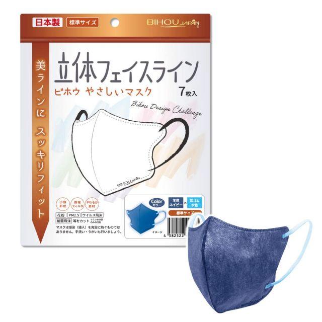 スタイル:ウエスタン◆商品名:【ビホウマスク安心の日本製自社製の国産高機能フィルタ使用!フェイスラインにスッキリフィット(小顔形状)多彩なカラーバリエーション個性に合わせて選べる楽しさ!男女兼用!立体フェイスラインやさしいマスク(ネイビー×水色)標準サイズ7枚入1袋