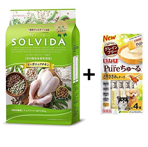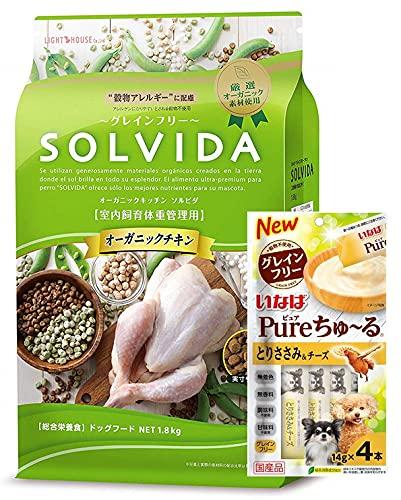 豊富な食材をバランスよく、おいしく食べて体重コントロール 太りやすく体重管理が必要な愛犬に、美味しさそのままに最新のペット栄養学に基づいた理想的な栄養をヘルシーブレンド。 ソルビダ グレインフリーチキン 室内飼育体重管理用は高品質なオーガニックチキン、厳選された野菜やフルーツなど、新鮮なオーガニック原材料を贅沢に使用し、理想的な栄養をバランスよく愛犬に提供します。さらにアレルギーに配慮し、穀物類は一切使用しておりませんので、腸に負担をかけることなく消化ができます。また、ユッカシジゲラ抽出物を配合することで、体臭や便臭の軽減をサポートします。 安心のオーガニック素材 自然の中でのびのび育ったオーガニックチキンをたんぱく源のベースとして使用し、オーガニック野菜やフルーツをバランスよく配合しています。 農薬、化学肥料を過去3年間使用していない畑で栽培され、化学添加物、保存料、遺伝子組み換えに由来するものを一切使用していないという、USDA(米国農務省)の厳しいオーガニック基準をクリアしています。 体重管理をサポート 愛犬の体重に配慮して、高い嗜好性はそのままに「低脂肪、低カロリー」に仕上げま