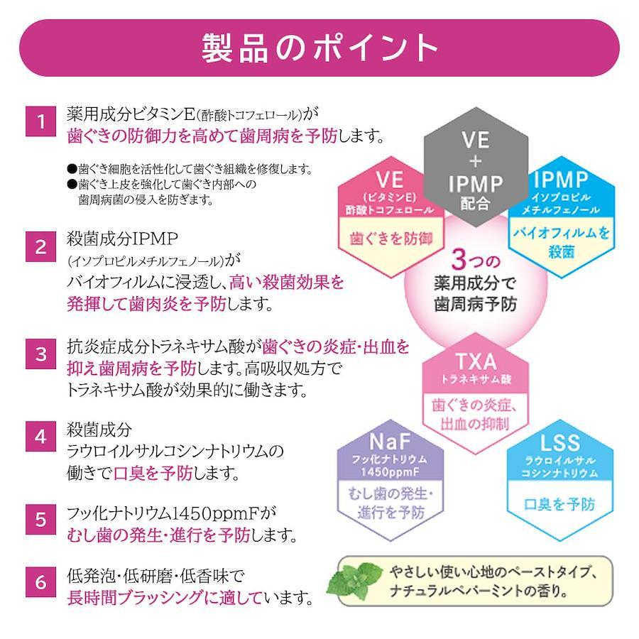 歯肉の防御力を高めて歯周病を防ぐペーストタイプ。 歯肉の防御力を高めるホストケア成分(ビタミンE)の配合により歯周病を予防するペーストタイプの歯磨剤 ~特長~ ①薬用成分ビタミンE(酢酸トコフェロール)が歯ぐきの防御力を高めて歯周病を予防します。 ②抗炎症成分トラネキサム酸が歯ぐきの炎症・出血を抑え歯周病を予防します。高吸収処方でトラネキサム酸が効果的に働きます。 ③殺菌成分IPMP(イソプロピルメチルフェノール)がバイオフィルムに浸透し、高い殺菌効果を発揮して歯肉炎を予防します。 ④殺菌成分ラウロイルサルコシンナトリウムが浮遊菌を殺菌し、口臭を防ぎます。 ⑤フッ化ナトリウム配合(1450ppmF)により、う蝕の発生、進行を防ぎます。 ⑥低発泡、低研磨、低香味なので、長時間ブラッシングに適しています。 内容量:90g フレーバー:ナチュラルペパーミント 低発泡・低研磨・低香味