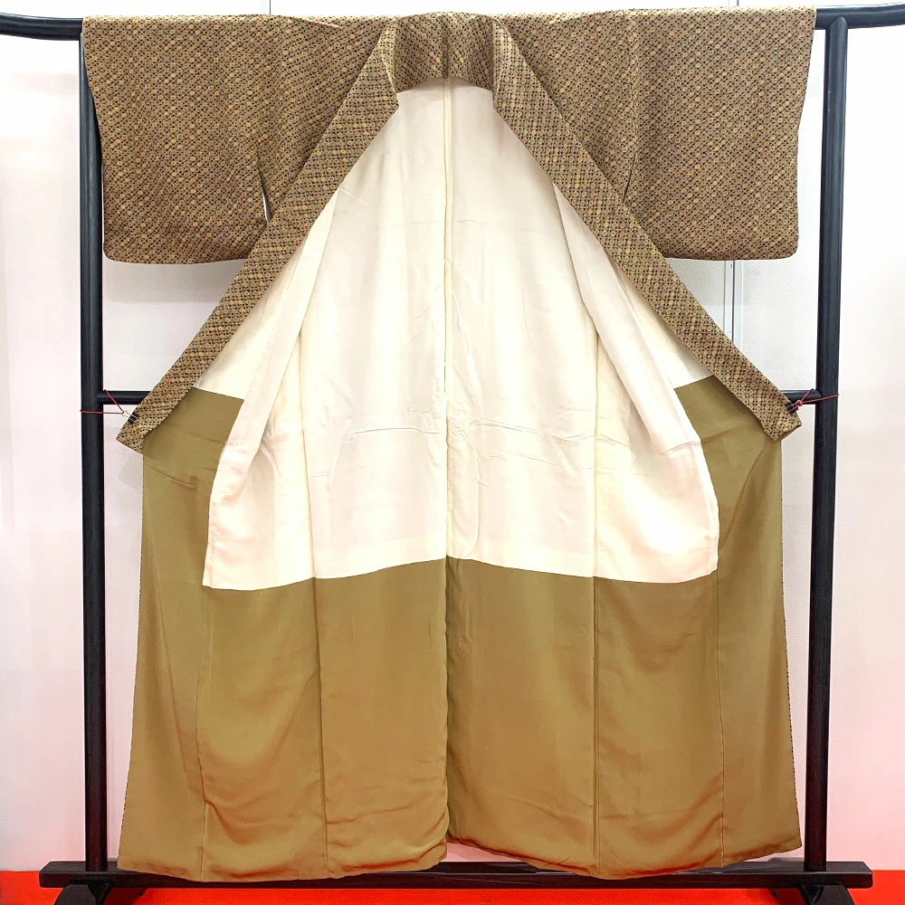 | 品名 | 【中古】小紋 ブラウン色 全通柄 正絹 シルク 呉服 着物 身丈 約155cm 古典 和装 和服 おしゃれ着 普段使い |