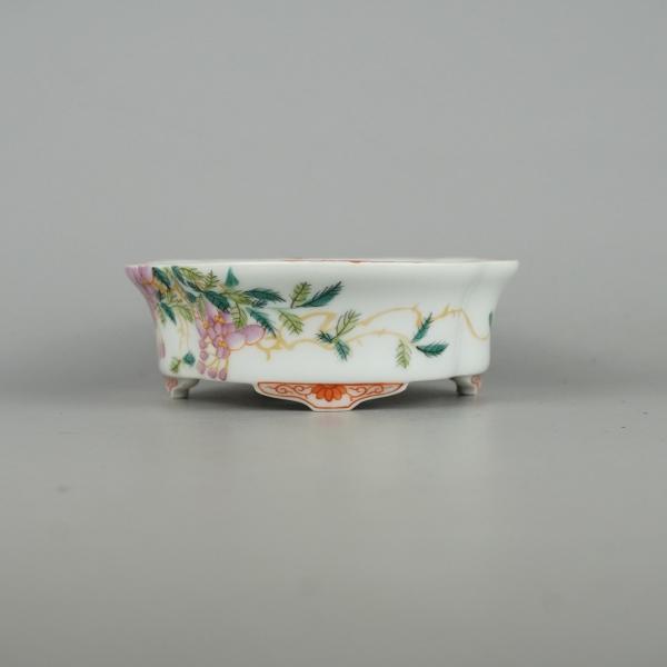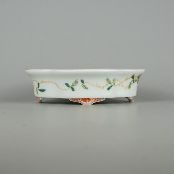 Used Wako bonsai pot, small, approximately 14.8cm long, featuring a quince flower and insect motifs. This Chinese-style pot is in excellent condition and is in excellent condition.
