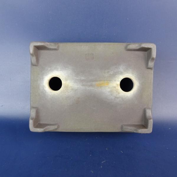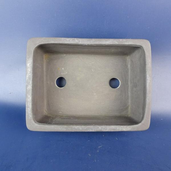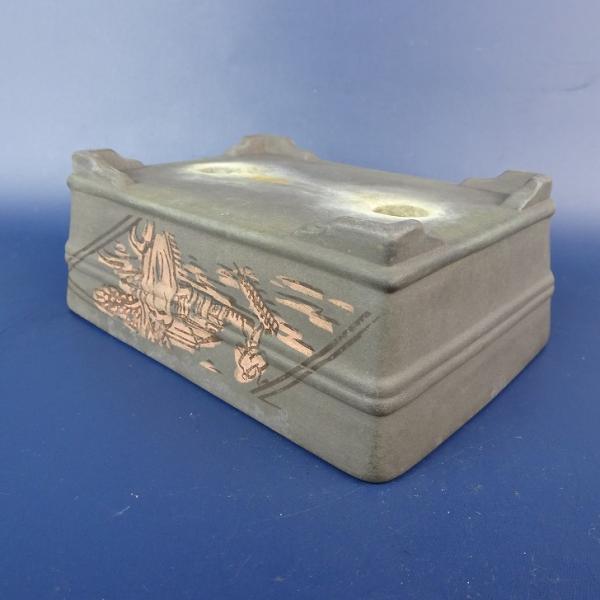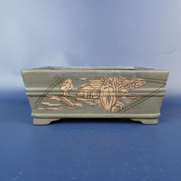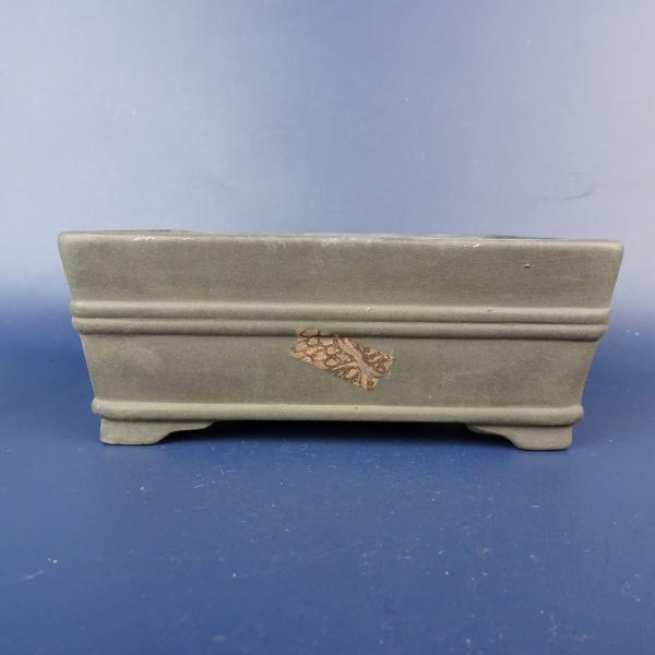 Used bonsai pot, small, approximately 12.7cm long, rectangular, with a center band, featuring a portrait or landscape. This clay pot is in excellent condition.