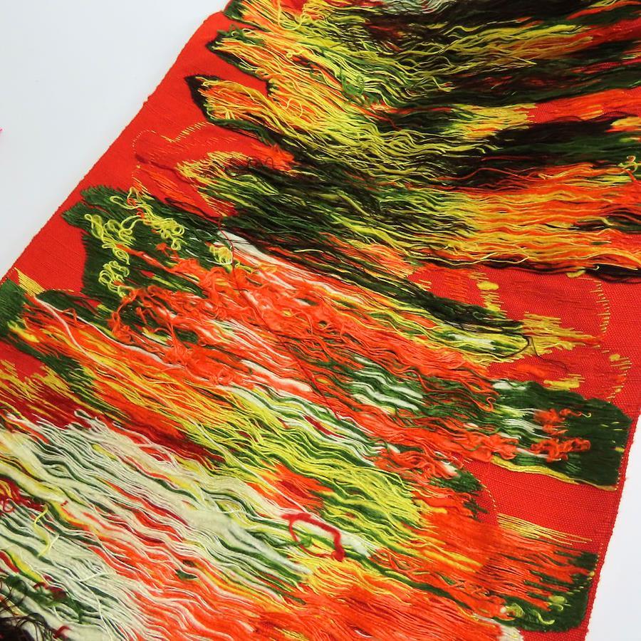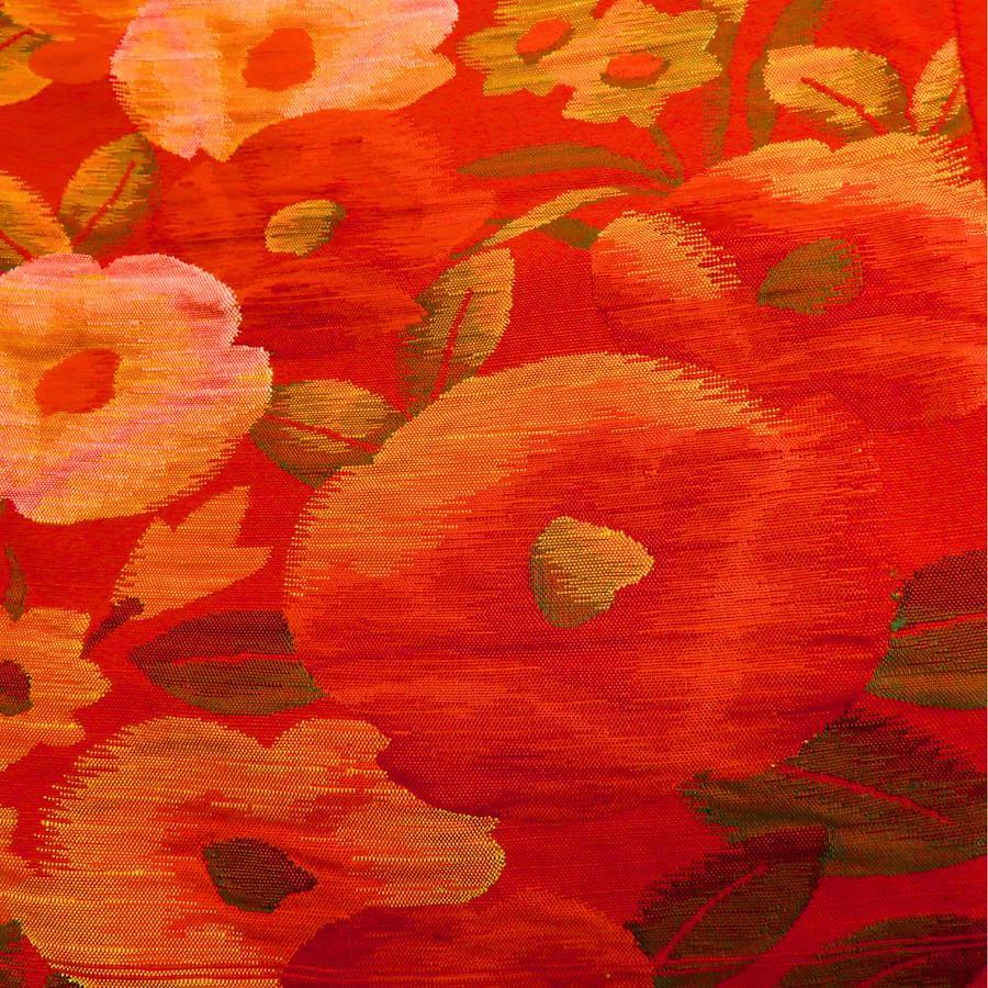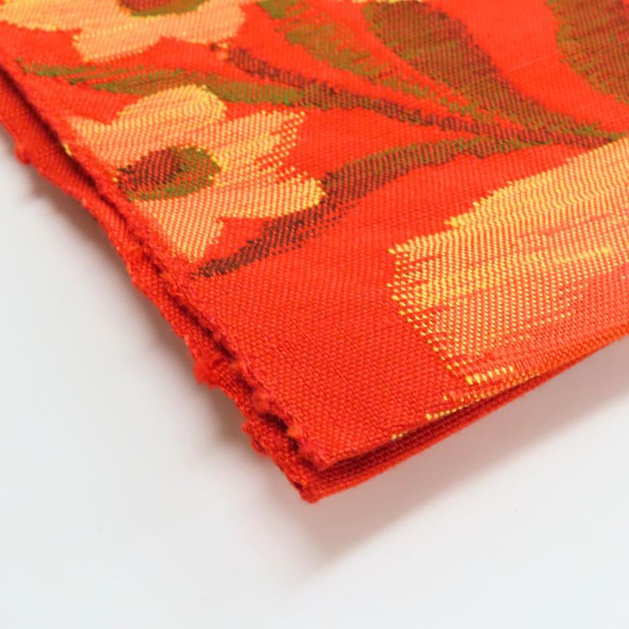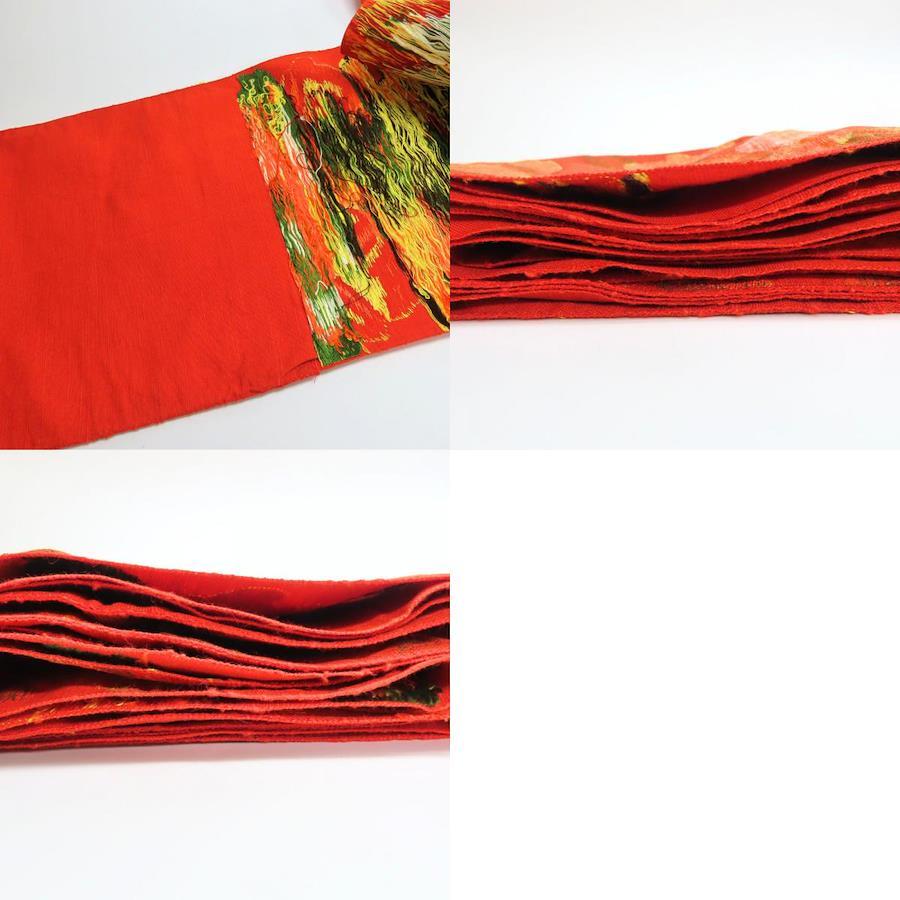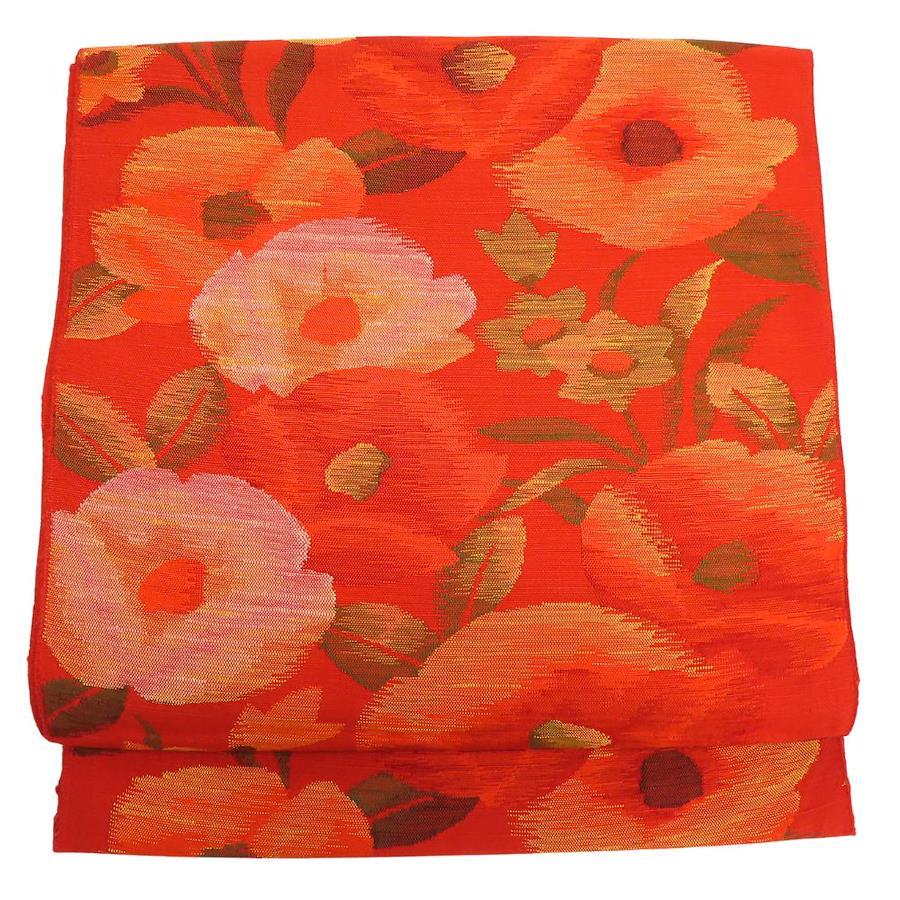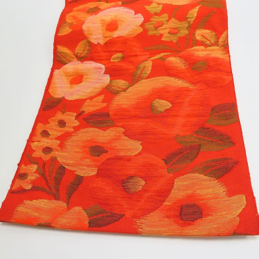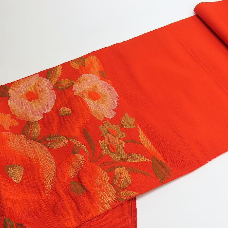| 品名 | 【中古】 名古屋帯 八寸 正絹(金銀糸除く) レッド系 オレンジ系 椿 六通柄 かがり仕立て レディース 女性 |