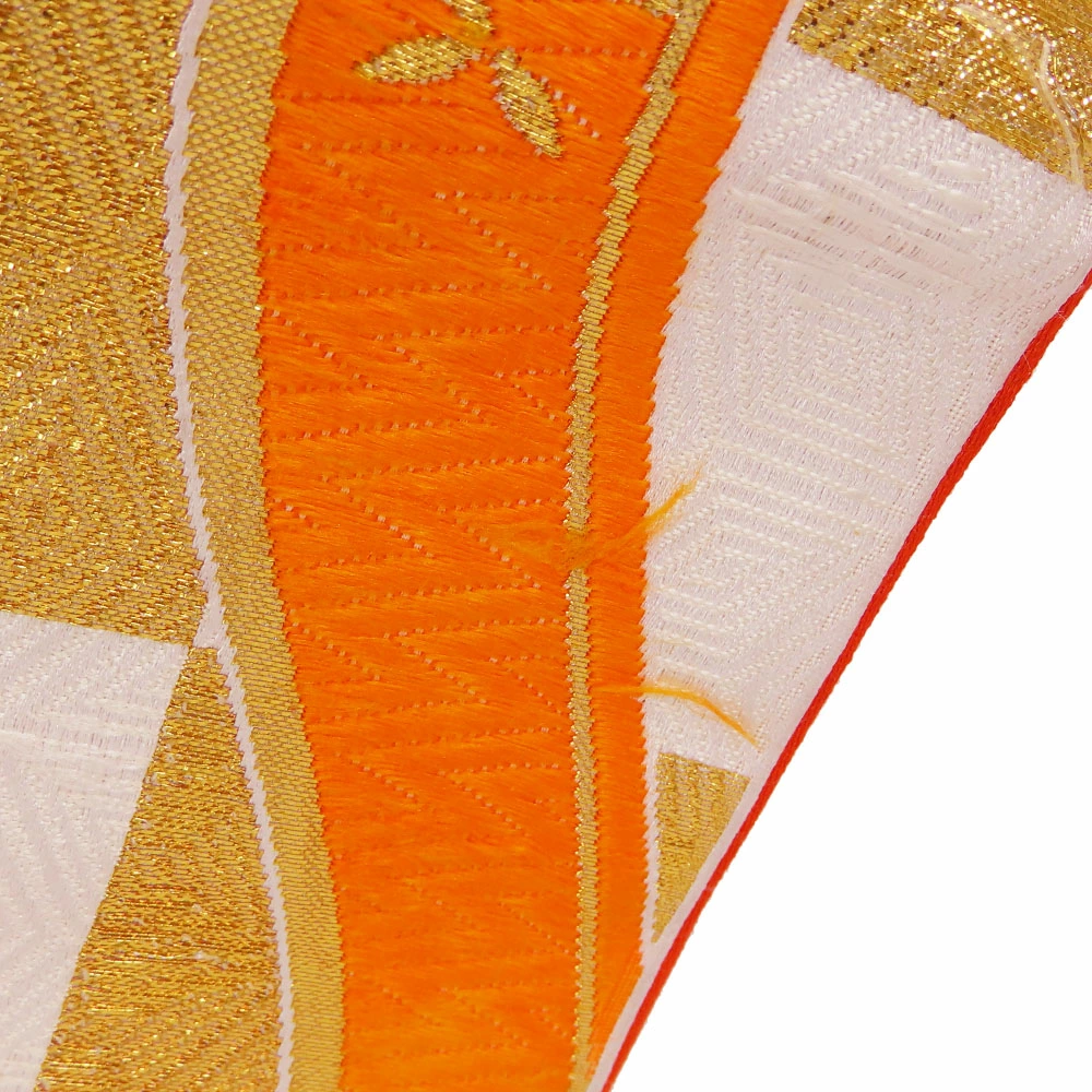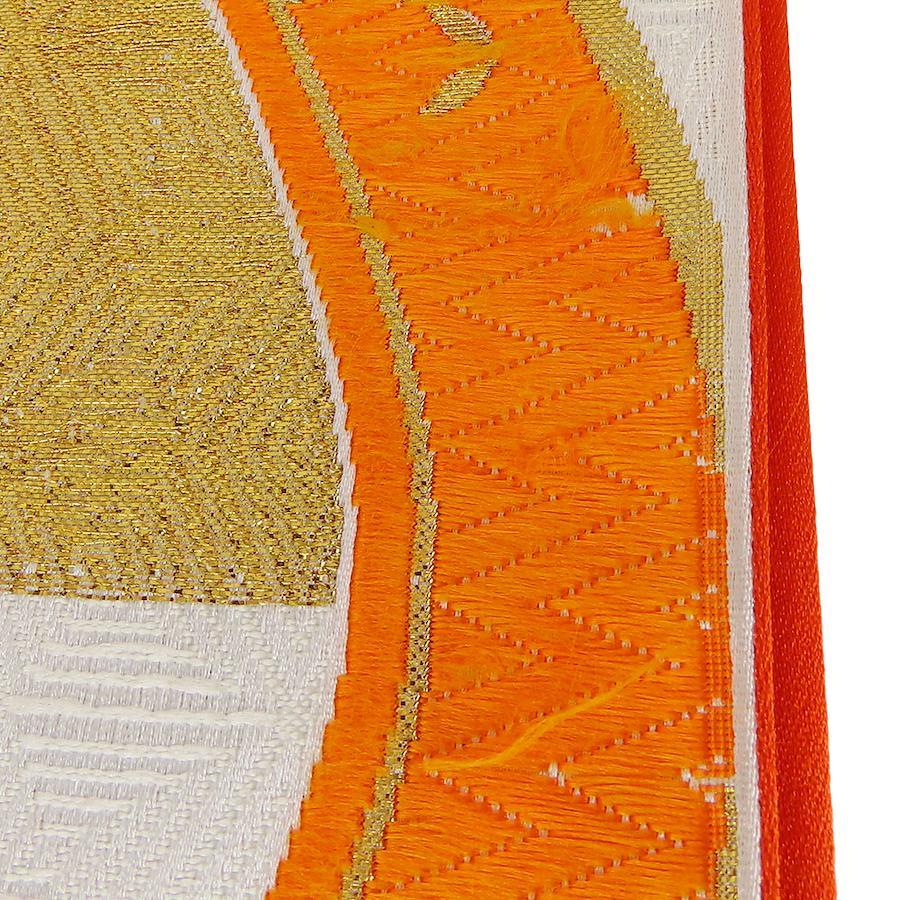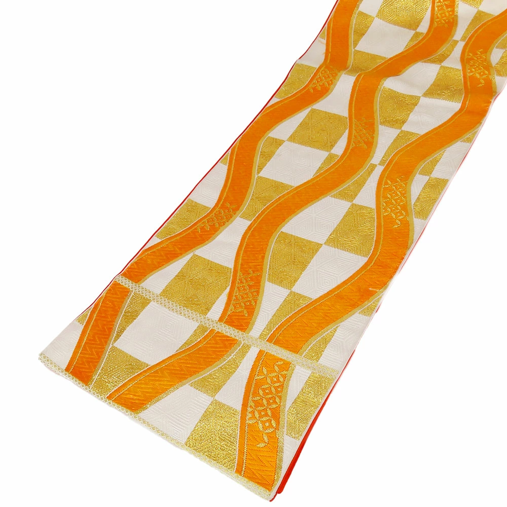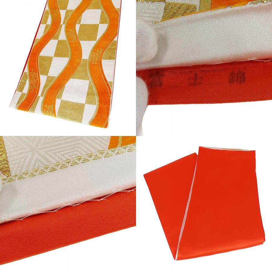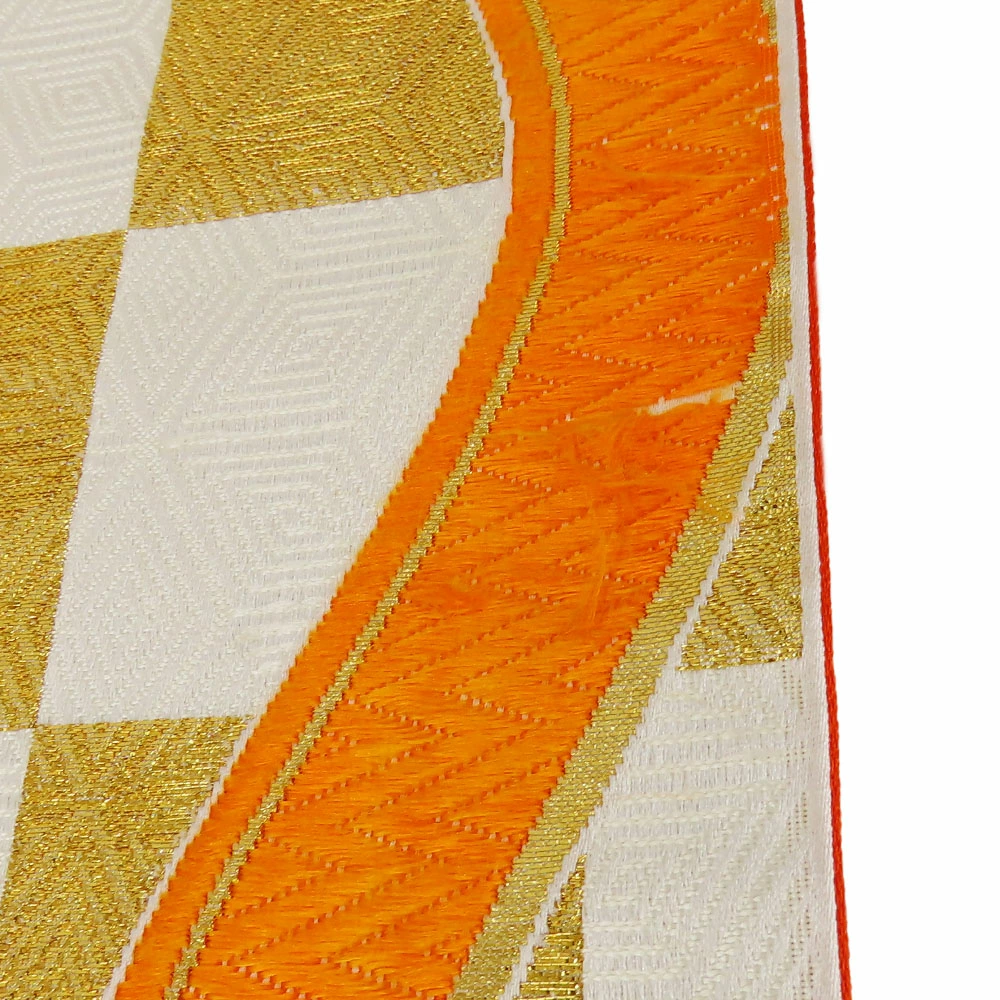 | 品名 | 【中古】 袋帯 七五三用 正絹(金銀糸除く) ホワイト オレンジ ゴールド 市松柄 よろけ縞 |