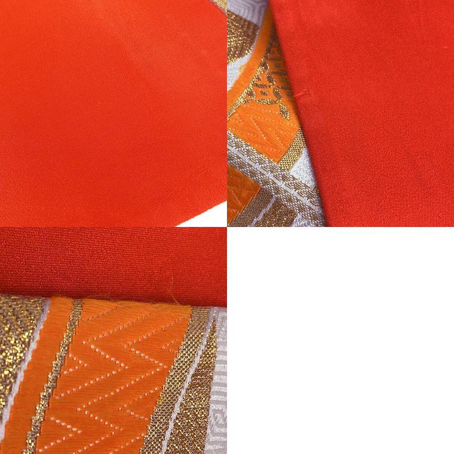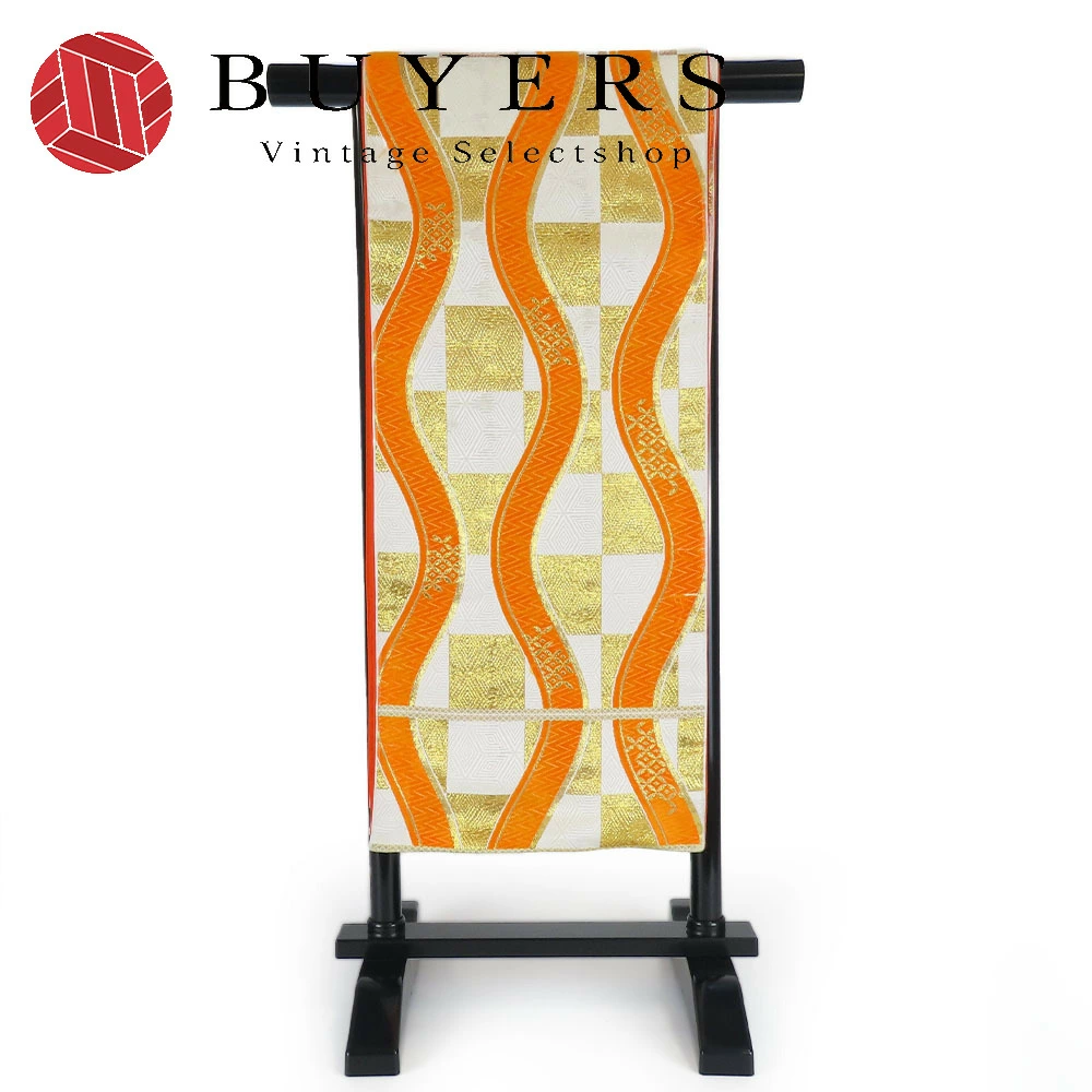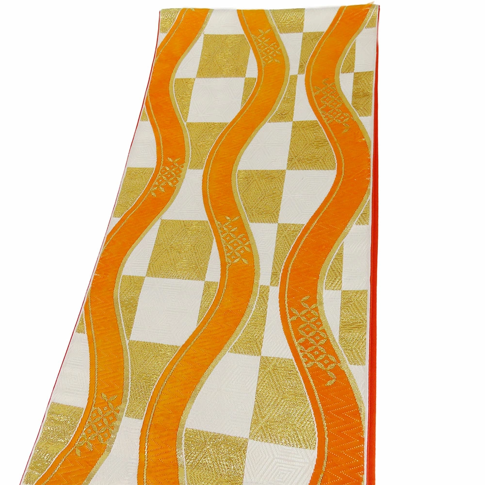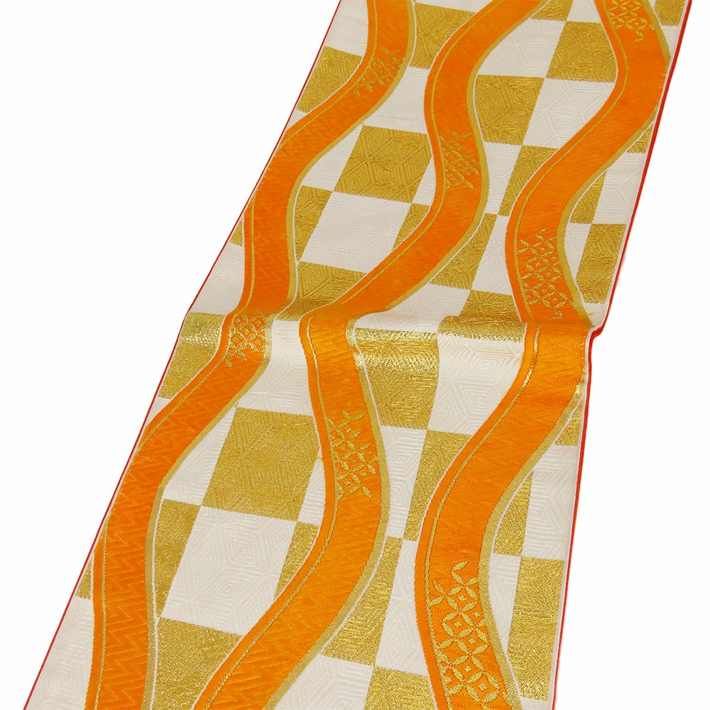 | 品名 | 【中古】 袋帯 七五三用 正絹(金銀糸除く) ホワイト オレンジ ゴールド 市松柄 よろけ縞 |