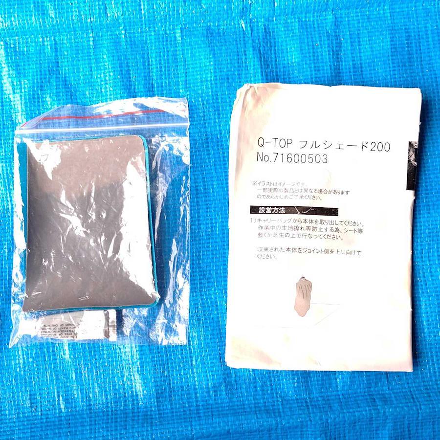 [タイプ] ロゴス Q-TOP フルシェード 200[型番] 71600503[重量] (約)2.2kg[サイズ] (約)幅200×奥行150×高100cm[収納時サイズ] (約)幅12×奥行12×高さ69cmcm[材質] フレーム/グラスファイバー、シート/ポリエステルタフタ UV-CUT加工、フロアシート/PEラミネートクロス[状態] 目立ったダメージなどはありませんが、表裏とも底部に砂の付着やそれに伴う汚れがみられます。また、バッグの底部分が少し裂けています。説明書は濡れて乾いた形跡があり、ページがくっついていたり破れたりしています。
