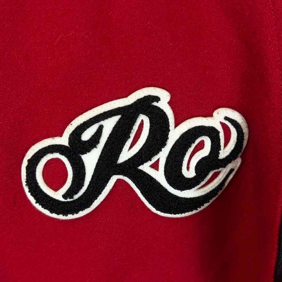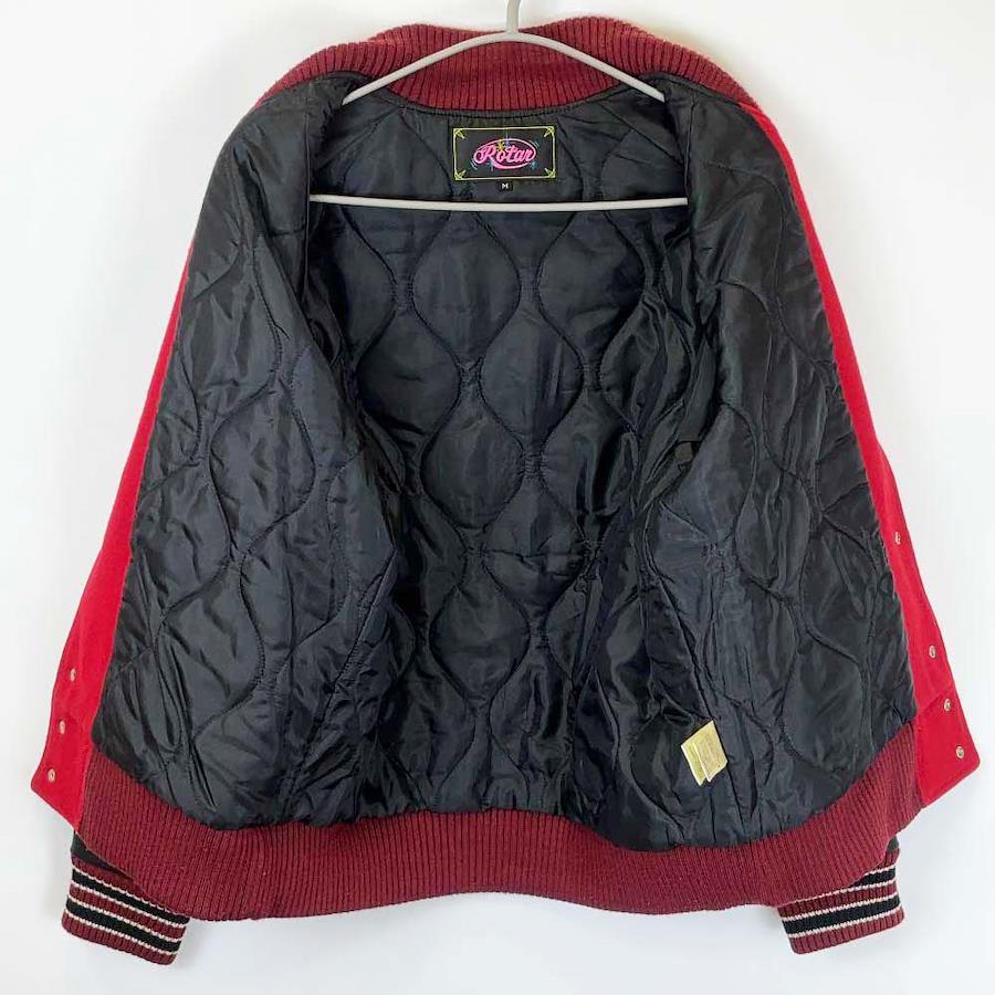 [ブランド] ROTAR ローター[タイプ] ロゴワッペン 袖レザー スタジャン[表記サイズ] M[対象] メンズ[カラー] レッド[身幅] 約52cm[着丈] 約64cm[裄丈] 約84cm[状態] 使用感があり、汚れや毛羽立ちがみられます。また、タバコの匂いがします。