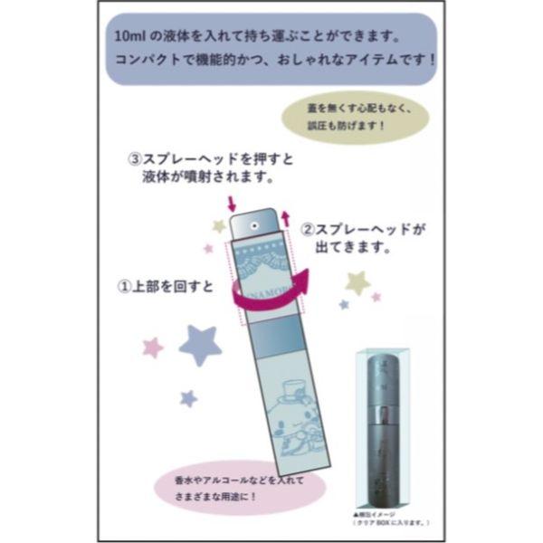 10mlの液体を入れて持ち運ぶことができます!!好きなフレグランスや、消毒液などを入れてスタイリッシュに持ち運べます♪エンボス風プリントを施しており、デザインには立体感があり高級感が漂います!!まさに大人可愛い♪【使い方】1.上部を回す。 2.スプレーヘッドが出てきます。 3.スプレーヘッドを押すと液体が噴射されます。《約φ23×H100mm》