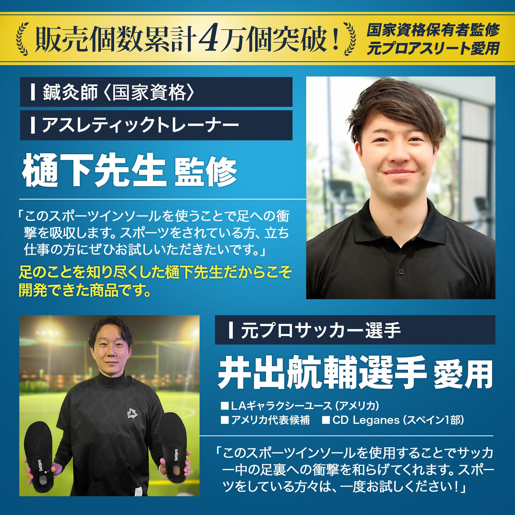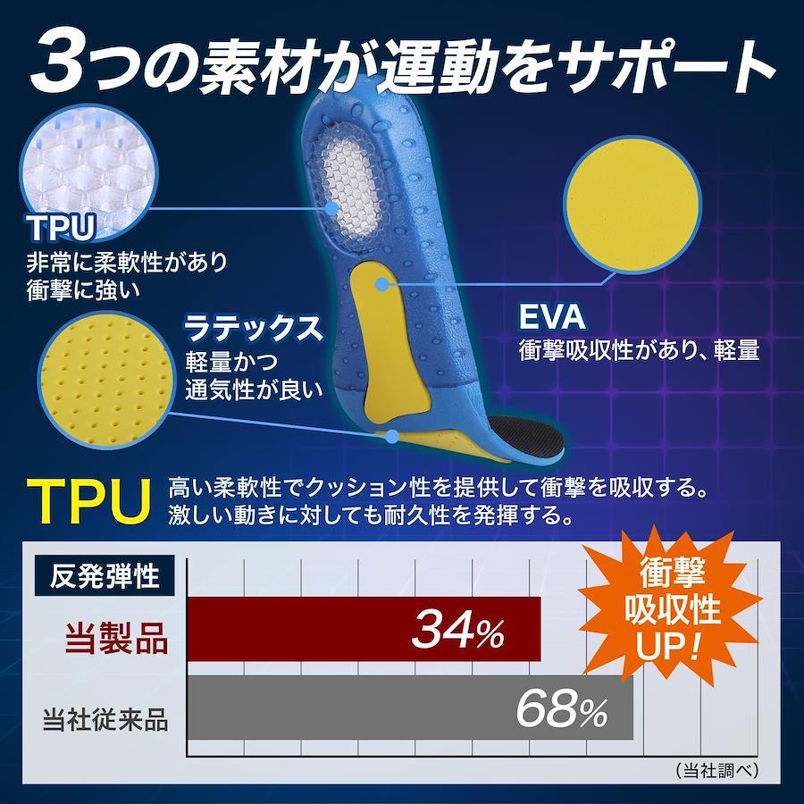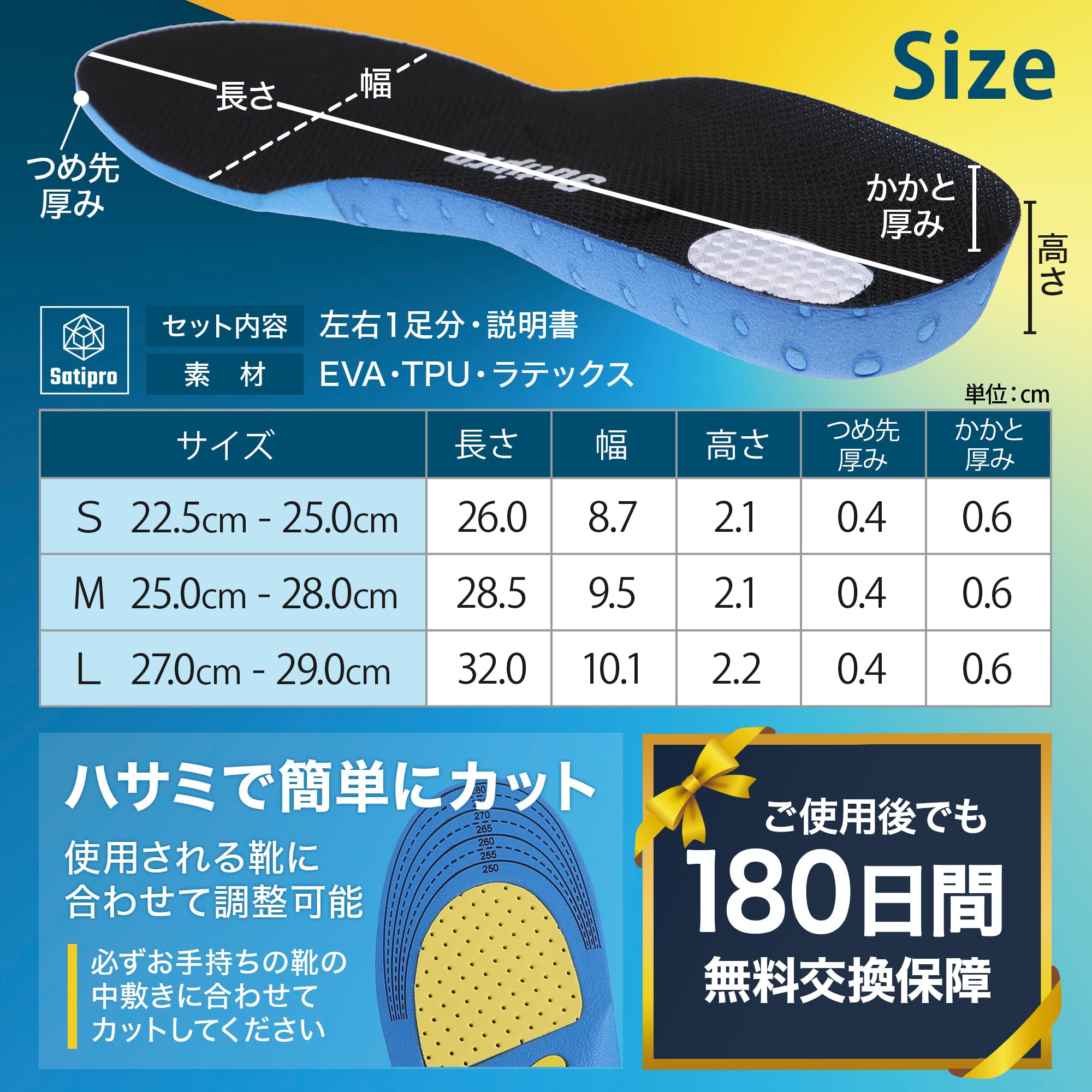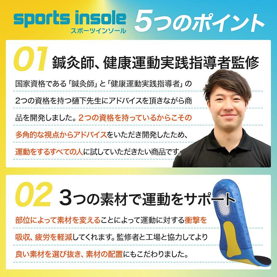 【トレーナー・鍼灸師監修/スポーツインソール】国家資格である鍼灸師で、アスレティックトレーナーでもある樋下先生監修。「Satiproスポーツインソール使うことで、足への衝撃を吸収します。スポーツをされている方や、立ち仕事の方にぜひお使いいただきたいです」 【3つの素材で衝撃を吸収】足裏前面のラテックスはクッション性がある素材。滑り止めに効果も。足裏中央のEVAは、弾力性がありやわらかく衝撃に強い素材。かかと部分のTPUは弾力性が非常に強く衝撃に強い素材。3つの素材で足裏への衝撃をしっかりと吸収します。通気性抜群でムレずに快適。 【3サイズ展開/ハサミで調整可】Sサイズ(22.5cm~25.0cm)、Mサイズ(25.0cm~28.0cm)、Lサイズ(27.0cm~29.0cm)の幅広いサイズ展開。男性でも女性でもご使用いただけます。ハサミで簡単にカットできるので、使用される靴に合わせて調整できます。 【ご使用シーン】しっかりとした衝撃吸収でスポーツシーンはもちろんのこと、日常使いまで。ランニング、ウォーキング、各種スポーツ、アウトドアから、通勤、通学、立ち仕事、営業周りまで幅広くお使いいただけます。 【商品仕様】○商品名:SPORTS INSOLE/スポーツインソール ○サイズ:Sサイズ(22.5cm~25.0cm)、Mサイズ(25.0cm~28.0cm)、Lサイズ(27.0cm~29.0cm) ○セット内容:左右1足分、説明書 ○素材:EVA、TPU、ラテックス ○男女兼用 ○ブランド:Satipro
