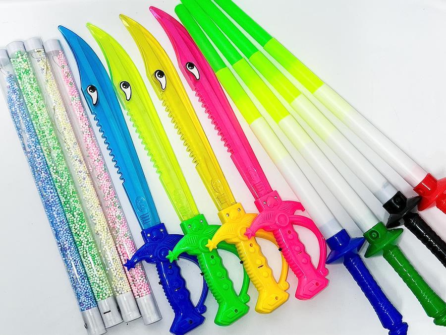 ★当店は多店舗経営のため、商品は十分ご用意しておりますが、 同一商品にご注文が殺到した場合寸差で売り切れとなる場合がございます。 その際は別途ご連絡をさせていただきますので、何卒ご了承いただきます様お願いいたします。【1】ビニール玩具、光り物おもちゃの不良品の返品・交換はできません。 商品の特性上、全ての商品に不良品が混ざっているわけではありませんが、 不良品の発生の防ぎようがなく業務用として不良品の返品交換は受け付けておりません。 ※不良リスクが出ることをふまえた上で、ご注文数量を必要数量より多めにしたり 販売時には、高めの価格設定をして頂き販売することをお薦め致します。 【2】予告なくパッケージのデザインや、商品の仕様変更があります。 色・柄・仕様等は予告無く変更となる場合がございます。そのため、 画像と絵柄が異なる場合がございます。予めご了承ください。 大きく変わる場合にはお知らせ致します。 【3】付属の電池はテストモニター用です。 製品に電池が入っている場合、お試し用のサービスとして無料でつけているテスト用電池の為、 すぐに切れる可能性があります。これに関する保証は出来ません。 商品サイズ:光るカラフルバトンスティック 約35cm 海賊剣 約39cm のびーる剣 約30cm 全長51.5cm ボタンを押すと光ります。電池交換不可 12種アソート 柄、色 指定不可(製造時期によりデザインが変わる事があります)