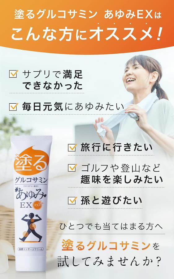 商品タイプ:あゆみEXプラス(レギュラー) 内容量:100g(約30日分) タイプ説明:あゆみEXの標準タイプです。塗るタイプのグルコサミンが初めての方は、まずはあゆみEXプラスをお試しください。 あゆみEXとは:ひざ・腰・肩などにマッサージしながら塗りこむタイプのグルコサミンです。人気の秘密は「グルコサミン」「プロテオグリカン」「コンドロイチン」「ヒアルロン酸」「コラーゲン」などのなめらか成分に加え、温感成分を配合でぽかぽかを即実感できること。チューブタイプなので、持ち運びしやすく衛生的と好評です。においもほとんどなく、周りに気をつかう必要がありません。湿布薬が使用できない方でもご使用いただけます。 ご注意ください:【公式】ジェイ・メディックスが販売する商品のみ品質が保証されております。【公式】ジェイ・メディックス以外の販売業者から購入された場合、品質の保証はできかねますのでご注意ください。