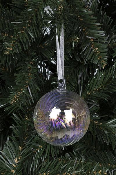 いろいろなオーナメントと合わせやすい透明なボールに虹色の輝きを含ませ、渦状のなめらかなラインを施しました。日本ではプラスチック製にその座を譲り、あまり見かけなくなった感のあるガラス製のボール。しかし、その風合は繊細なものだけが有するオーラを放っています。プラスチックにはない光彩と優越感をお楽しみください。
