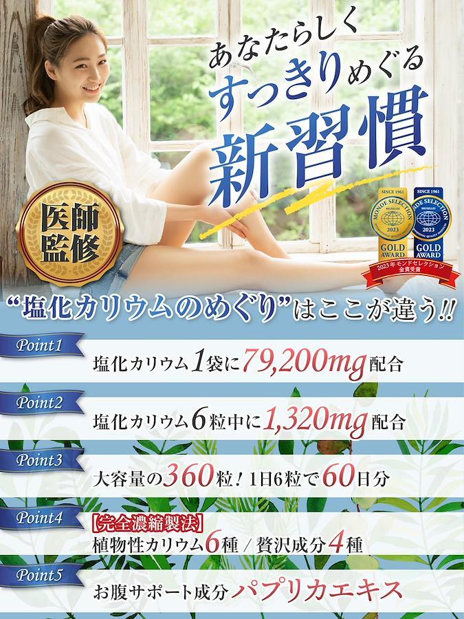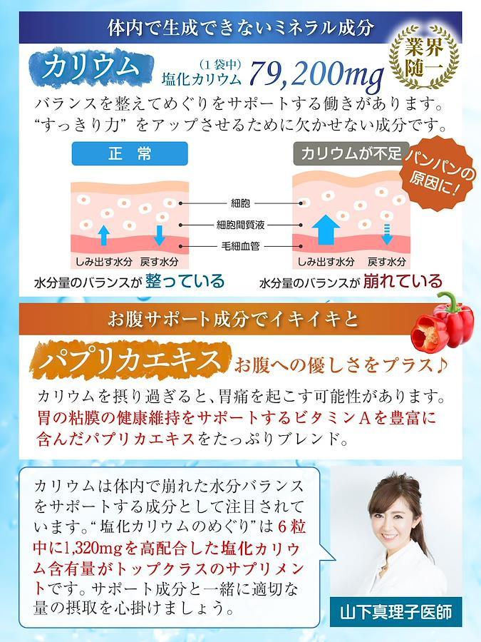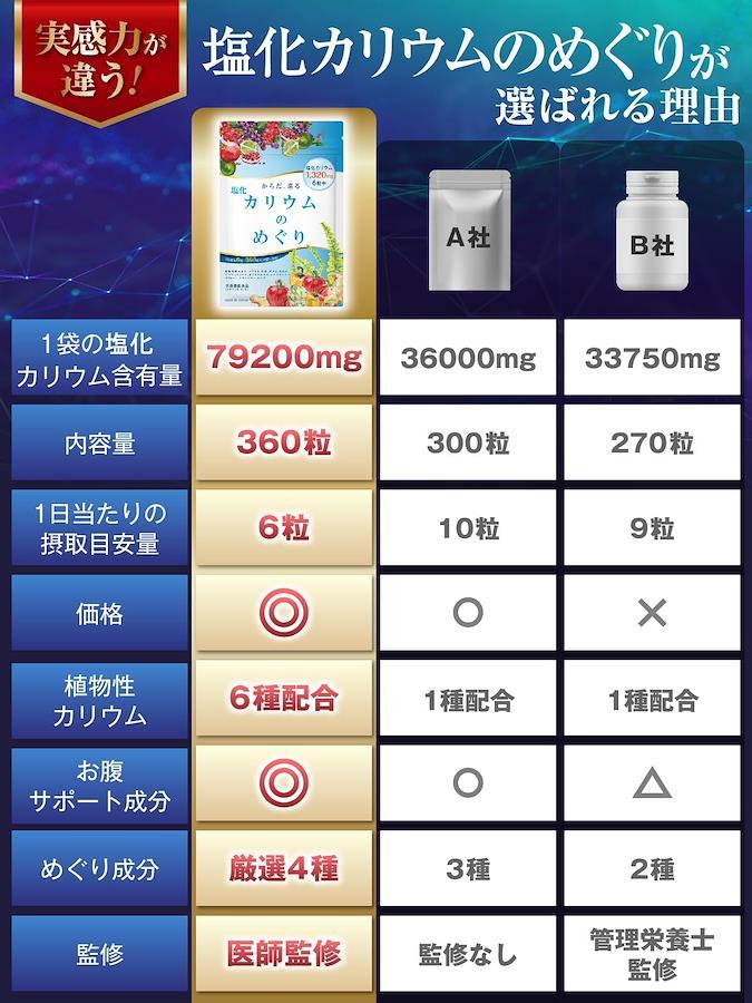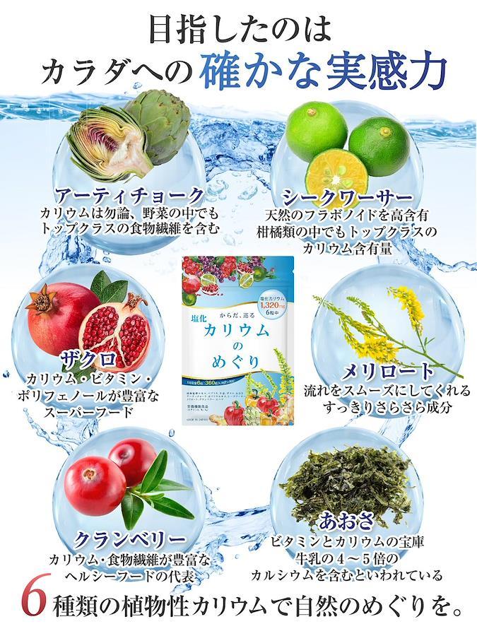 ■サイズ:??18.7x12.8x1.1cm;100g ?【圧倒的なボリューム】 ・内容量:97.2g( 270mg×360粒 約2ヶ月分) 1粒に含まれる塩化カリウムは220mg 1日6粒(約1,320mg)を目安にお召し上がりください。 ?【医師監修サプリメント】 医師の監修を受けて規格・製造に徹底的にこだわりました。 ?【飲みやすいサイズ設計】 多くのモニターの意見を元に、飲みやすいサイズにこだわりました8mm×4mm粒 ?【安心・安全の国内製造】 GMP基準…原材料から製造、出荷にいたる全ての工程を国内工場にて一貫製造し、厚生労働大臣が定めた厳正な基準をクリアしています。 ISO認証…顧客満足を向上させるためのマネジメントシステムに関する国際規格「ISO9001」の認証を取得しています。 ?賞味期限…約2年間です。(お届けのタイミングによって多少変動致しますが、十分な品質を保ちお届致します) ■重要なお知らせ