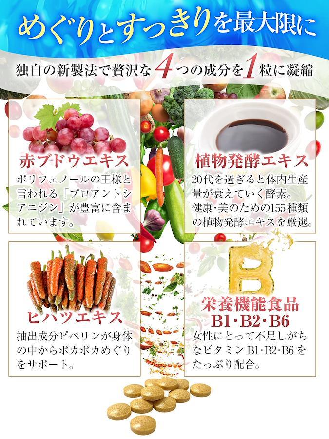 原材料・成分パプリカ粉末(スペイン産)、ヒハツ粉末、植物発酵エキス末、ジンジャー粉末、ザクロ粉末、あおさ粉末、アーティチョーク粉末、赤ブドウエキス末、シークワーサー粉末、メリロート粉末、クランベリー粉末/塩化カリウム、ビタミンB1、ビタミンB2、ビタミンB6、結晶セルロース、ステアリン酸Ca、微粒二酸化ケイ素、精製セラック