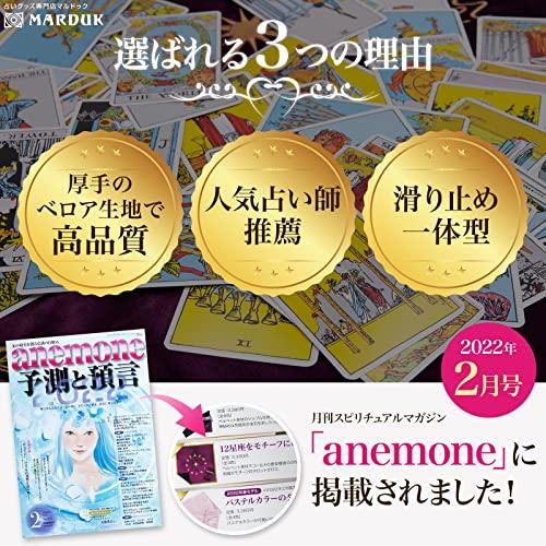 【anemone2022年2月号掲載】 占いグッズ 専門店 MARDUK (マルドゥク)が スピリチュアル & ヒーリング マガジン anemone に取り上げられました。ブランドの紹介、そして タロットクロス や クリスタルチューナー などを特集して頂きました。 【デザイン】 滑り止め付きの高級タロットクロス。ベルベット素材でゴールドの唐草模様のふちどりに十二星座の刺繍がモチーフ。神秘的な雰囲気をつくることで、落ち着いた気持ちでタロットリーディングに臨むことが出来ます。タロットカード オラクルカード ルノルマンカード など カード占い 全般に重宝する占いのマストアイテムです。 【 滑り止め付き 】布地は高級感あふれる厚手のベルベット素材を使用、上品な光沢と限りなく絹に近い独特の風合いのベルベット生地です。裏には滑り止めが付いているので、タロット占い初心者の方でもクロスがずれる心配がありません。プロの占い師にも人気の大判サイズのタロットカードクロス、アルタークロス です。 【タロットポーチ】シンプルでかわいいタロットカードケースもセット。大切なタロットデッキ を収納できるので持ち運びにも便利。タロットクロス用のポーチではなく、タロットカード用のポーチですのでご注意下さい。誕生日 母の日 クリスマス などの記念日に、 占いグッズ の プレゼント としても最適です。 【セット詳細】■セット内容:滑り止め付 タロットカードクロス 1枚、タロットポーチ 1枚 ■サイズ:タロットクロス 約65cm×約65cm タロットポーチ 約20cm×約13cm ■素材:ベルベット(ポリエステル100%)粗悪な偽物やコピー商品が出回っておりますのでご注意下さい。商標登録6615800