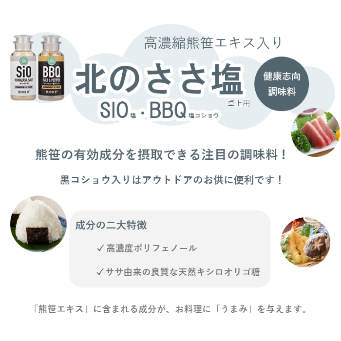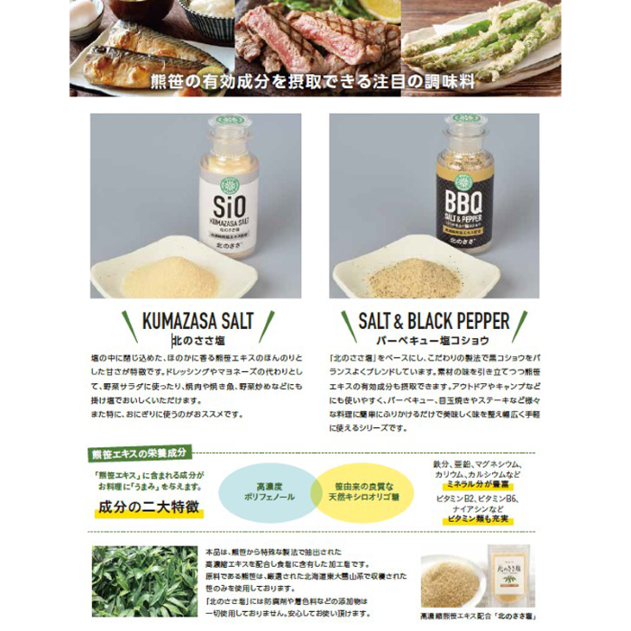 北海道東部に自生するクマザサから特殊製法で抽出された、ミネラル分豊富な熊笹エキスを練りこんだ塩です。