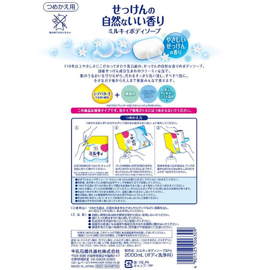 商品の形状 ボディソープ肌タイプ 全肌質ブランド ミルキィ香り 石けん素材タイプフリー 無着色, パラベンフリー対象年齢 大人商品の個数 1ユニット数 2000.0 ミリリットル特徴 つめかえ用商品パッケージ数 1