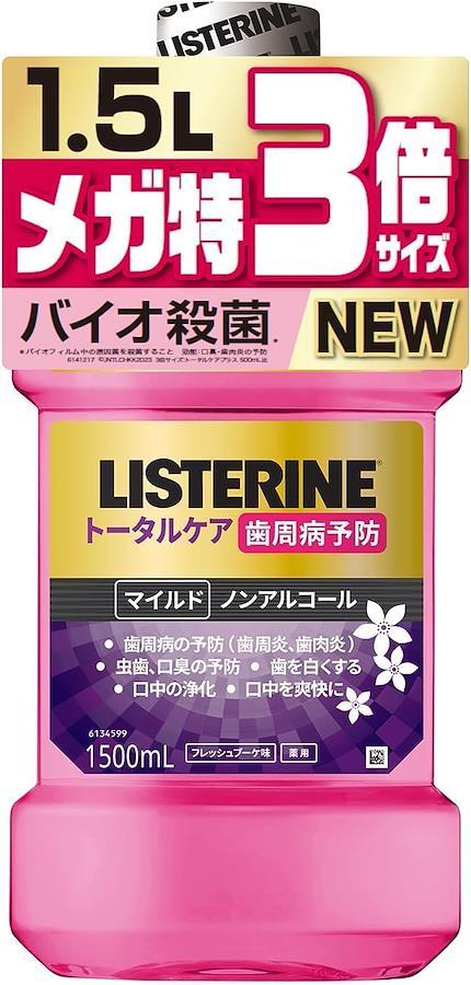 【高機能オールインワン】【液体歯磨】【医薬部外品】口当たりの良いマイルドなノンアルコール処方で、辛さがや刺激が苦手な方も毎日使いたくなるような使用感。殺菌成分に加え抗炎症成分(GK2)配合で歯周病予防※。歯周病予防から、口臭、ネバつき、虫歯、着色汚れ、口内の不快感まであらゆるお口のトラブルをケア。健康なお口に。※歯周病とは歯肉炎と歯周炎の総称です。 【バイオ殺菌*?のリステリン】有効成分がお口のすみずみまでゆき渡り、バイオフィルムの中まで浸透殺菌。トラブルの原因となる悪玉菌を減少させます。歯周病(歯肉炎・歯周炎の総称)や口臭予防にどうぞ。 *?バイオフィルム内の悪玉菌(口臭等の原因菌)を殺菌すること。 【歯周病+オールインワン】殺菌成分に加え抗炎症成分(GK2)配合で歯周病予防を実現。さらに「トータルケアシリーズ」の特徴を持つオールインワンの高付加価値マウスウォッシュ。 【使用方法】適量を30秒ほど口に含み、ブラッシングしてください。6歳以上~12歳未満の場合は約10mL(キャップ4分の1)、12歳以上の場合は約20mL(キャップ半分)、1日2回の使用をおすすめします。 【内容量】1500ml 【商品詳細】フレッシュブーケ味。ノンアルコール(低刺激) 【悪玉菌をバイオ殺菌*?】じつは、善玉菌と一緒に悪玉菌*も口から入っている! ?*悪玉菌:歯肉炎・虫歯・口臭の原因菌の塊である"バイオフィルム"の中に実は悪玉菌も潜んでいます。 だからリステリンのバイオ殺菌*?ケア。 *?バイオフィルム内の悪玉菌(口臭等の原因菌)を殺菌すること。 (#lf)(#lf)(#lf)商品購入前に、ストア紹介ページをご確認ください。