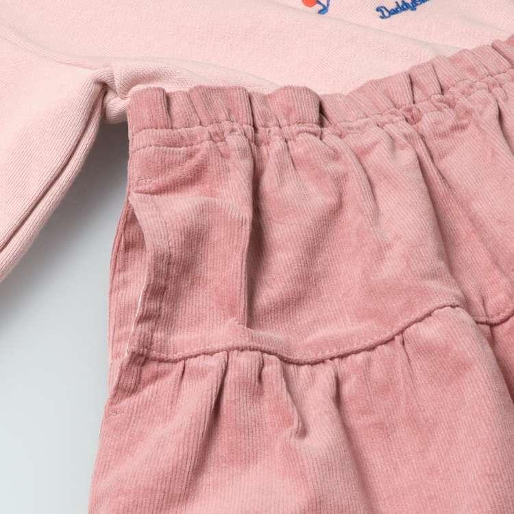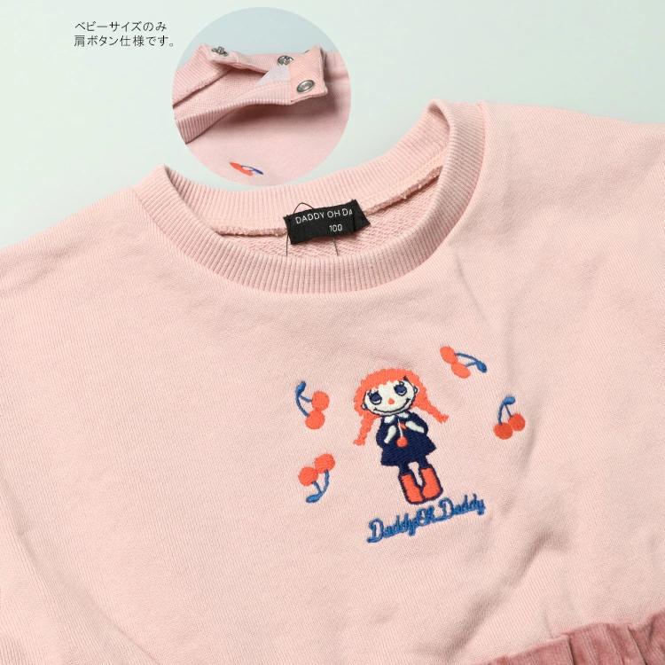 ダディオダディの人気キャラクター「ダディコちゃん」の裏毛ワンピースです。胸元部分のダディコちゃんとチェリーの刺繍がキュート♪ウエスト切り替えになっており、スカート部分はコーデュロイ素材で秋冬らしいデザイン。ストレッチ性のあるコーデュロイなので動きやすく、お出かけ着にもオススメです。90cmのみ肩ボタン仕様です。【アイテム】長袖 ロングスリーブ ワンピース シンプル ガーリー フェミニン カジュアル お洒落 オシャレ かわいい 可愛い 普段着 デイリーウェア お出かけ着 お外着 お外遊び着 子ども こども 女児 女の子 ガールズ キッズ ベビーサイズ トドラーサイズ 幼稚園 保育園 小学校 通園 通学 小学生 2024年秋冬物新作 丸高衣料 ピンク