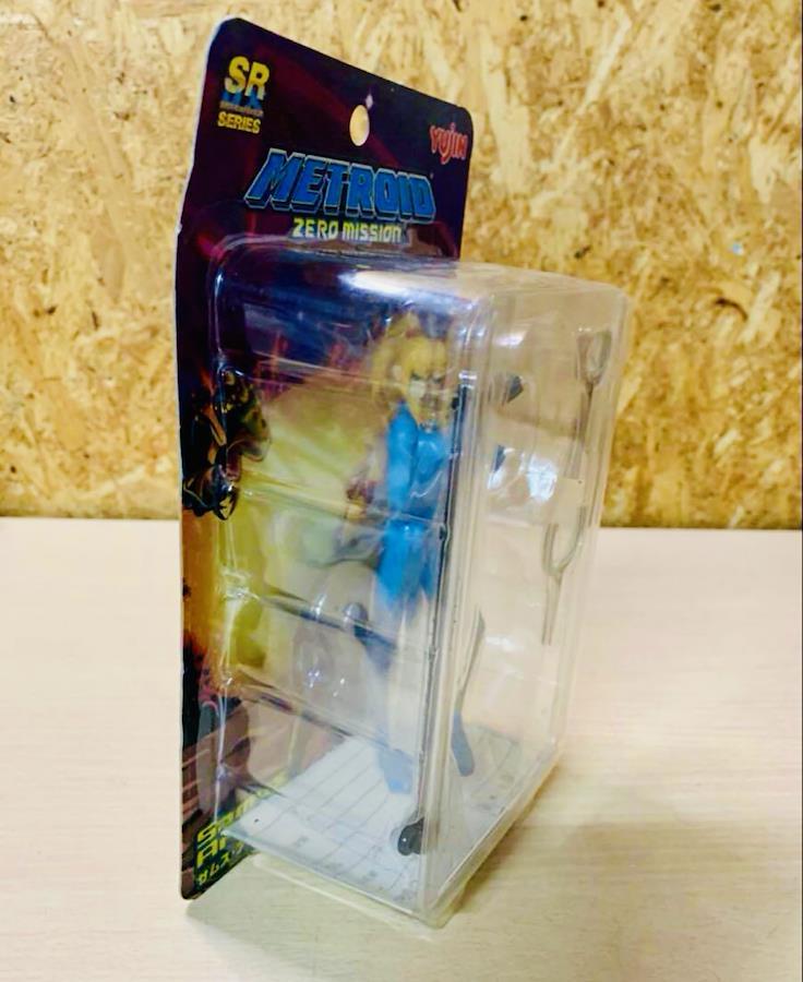 メトロイド ゼロミッションのサムス・アランフィギュア、青いコスチュームとスタンド付き。