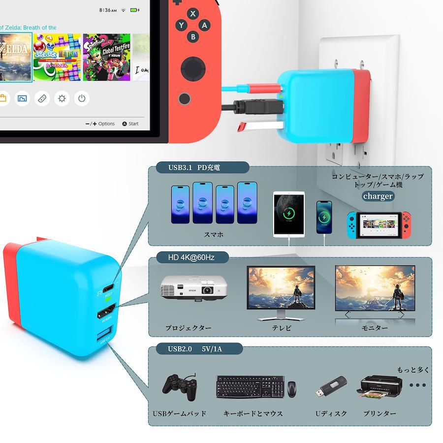 【外出時の負担を軽減】充電器とドッキングステーションが組み合わされドッキングステーションと窒化ガリウム(GaN)が一体となった急速充電器は、ハイエンドスマホ(iPhone15シリーズ対応)、MacBook、iPad pro、Switch などPD プロトコル対応のデバイスを急速充電するだけでなく、マウス、キーボード、USBメモリーなどのデバイスを統合でき、旅行や主張時の負担を大幅に軽減します。 【高速充電と機能拡張】3 つのインターフェースを 1 つのデバイスにまとめ、高速充電と機能拡張を実現しています。USB-C PDインターフェースは窒化ガリウム(GaN)によるPD3.0 プロトコルの高速充電を実現し、60W 急速充電によりモバイルデバイスに充分な電力を供給します。 USB-Aインターフェースは書込み425Mbps読取り434Mbpsの高速通信をサポートします。HDMIインターフェースはHDMI2.0プロトコルを採用し、4K/60Hz、4K/30Hz、1080P/60Hzなどのマルチスタンダードコードレートビデオ出力と32ビットオーディオ出力をサポートします。 【大画面のゲームをスマートに楽しく】HDMIインターフェースはHDMI2.0プロトコルを採用し、4K/60Hz、4K/30Hz、1080P/60Hzなどのマルチスタンダードコードレートビデオ出力と32ビットオーディオ出力をサポートします。例えば、大画面のモニターに接続し、Nintendo Switchのゲームをプレイしながら同時に充電できますのでスマートに長時間のゲームセッションを楽しむことができます。 【軽量&コンパクト】非常に高い特性を備えた新半導体素材GaN(窒化ガリウム)を採用したことで手のひらサイズに小型軽量となり、気軽にカバンやポケットに入れて持ち運ぶことができます。 【7種類の保護で安心・安全】短絡保護、電磁界保護、過電流保護、過熱保護、不足電圧保護、静電気保護及び、過電圧保護の7種類の保護機能を搭載し、充電の安全性を確保します。 【※PSE認証済み製品】