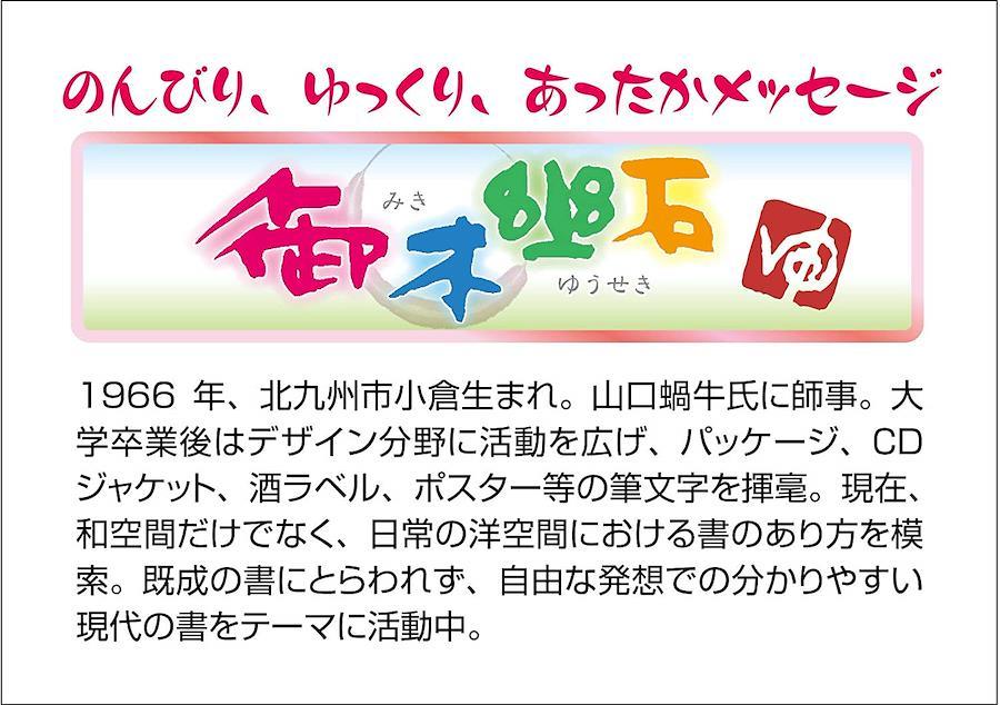 高校入学後、山口蝸牛氏師事、書に転向。大学卒業後はデザイン分野に活動を広げ、パッケージ、CDジャケット、酒ラベル、ポスター等の筆文字を揮毫。