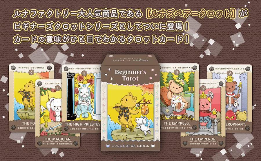 ルナファクトリー大人気商品である【ルナズベアータロット】がビギナータロットシリーズとしてついに登場! カードの意味がひと目でわかるタロットカード! 57×87cmで作られた78枚のカードは従来のサイズよりも少し小さめなので、女性の方もカードが持ちやすく、リーディングがしやすい作りになっています! 持ち運びにも便利なコンパクトサイズです。 重厚感のあるボックスはキラキラ輝くホログラム仕様! 七色に反射するデザインは、非常にきれいでとても高級感を感じさせます! それぞれのカードには正位置・逆位置の意味が直接書いてあるので、カードの意味がパッと見てわかり、初心者の方にも最適です。 スプレッド方法は付属のスプレッドカードをご覧ください! タロットカードへの一歩を可愛いテディベアと一緒に始めてみましょう!