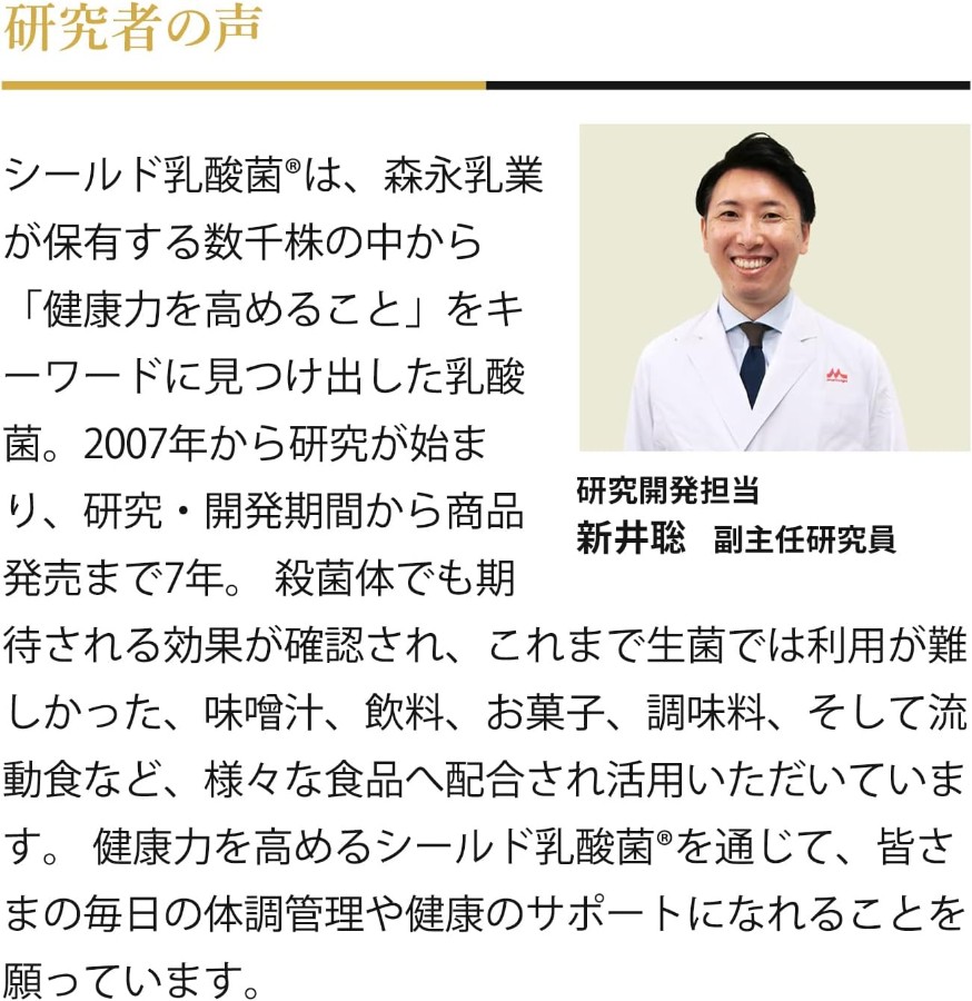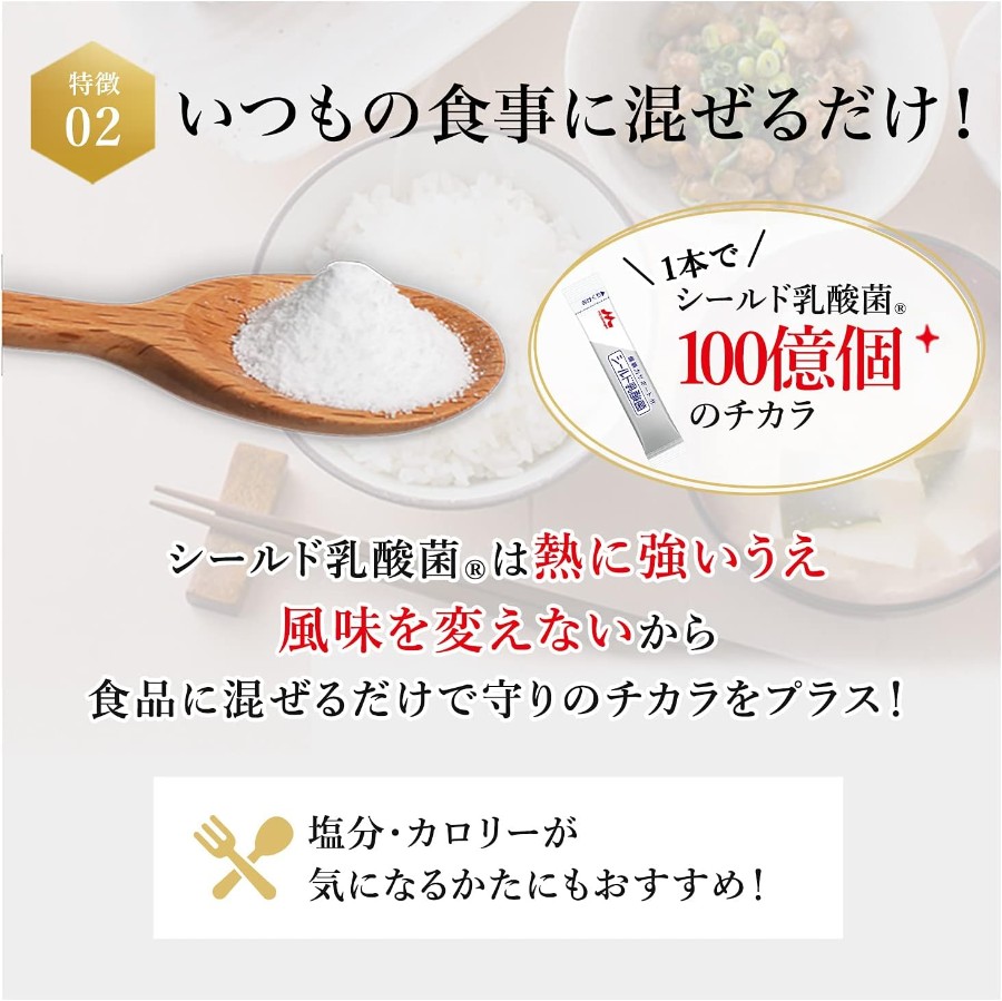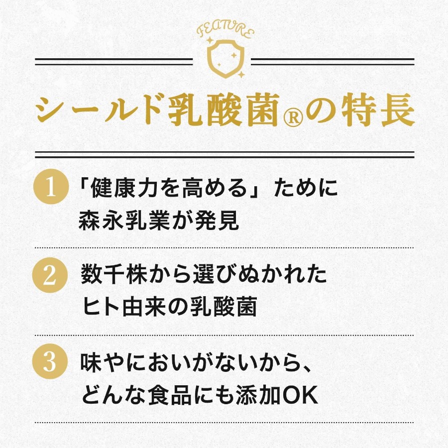 ※FBA在庫の都合上、森永乳業配送の場合(出荷ではない場【森永乳業だから発見できたシールド乳酸菌サプリ】乳酸菌・ビフィズス菌国内サプライヤーシェアNo.1サプリメントの森永乳業が自信をもってお届けする乳酸菌サプリメントです 【いつもの食事に混ぜるだけ!】1本のサプリメントでシールド乳酸菌100億個のチカラ。シールド乳酸菌サプリは熱に強いうえ風味を変えないから食品に混ぜるだけで守りのチカラをプラス!塩分・カロリーが気になるかたにもおすすめ!家族全員の続けやすさをアシストします! 【アレルゲンフリー】大切なご家族が毎日口にするものだから安心してお召し上がりいただけるようこだわりました。 【シールド乳酸菌サプリの特徴】①「健康力を高める」ために森永乳業が発見 ②数千株から選びぬかれたヒト由来の乳酸菌 ③味やにおいがないから、どんな食品にも添加OK お客さまにご安心していただける品質の商品をお届けするため、製造からお客様へお届けするまでの全てにおいて、一貫して品質管理をしております。森永乳業㈱が直接販売のみ行っている商品ですので、森永乳業㈱通信販売グループ以外からの発送商品は模倣品の可能性があるため、ご注意ください。
