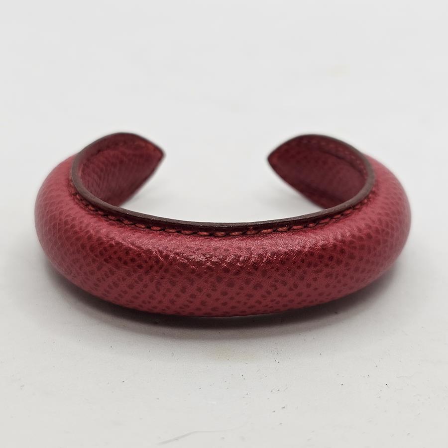 鮮やかなレッドカラーのレザーが使用されており、腕元に情熱的で洗練された印象を与えます。太めで丸みのあるデザインと、レザーの美しい質感が魅力的です。