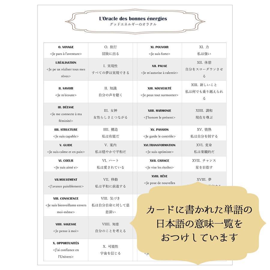 ?良い波動で人生を明るくする、タロットのパワーを取り入れたオラクルカード タロットのメジャーアルカナをモチーフにしたこのオラクルカードは、あなたのすべての選択とすべての疑問に寄り添うために良い波動のエネルギーを提供します。 タロットのメジャーアルカナをそれぞれ22枚の陰(黒)のカードと22枚の陽(白)のカードとして、内側に向けた働きかけと外側に向けた働きかけとして使い分けることができます。44枚全てを使うことで同じ絵柄のカードを引く可能性もあるという、通常のタロットではあり得ない非常にユニークなデッキとなっています。 シンプルでありながらキュートなアートワークは金の箔押しが随所に使用されており、爽やかな高級感があります。 タロット上級者さんは解説書のメッセージ以上のインスピレーションを受け取ることができるため、よりお楽しみいただけます。 白と黒のバイカラーポーチ&お守りのミニサービスカード付き カード枚数 44枚?カードサイズ 縦13㎝ 横8.5㎝?ボックスサイズ 縦17㎝ 横12.5㎝ 厚み3.5㎝ フランス語解説書 33ページ(※日本語訳された解説書ではありません。)?解説書の内容・カードの表記はフランス語で書かれています。