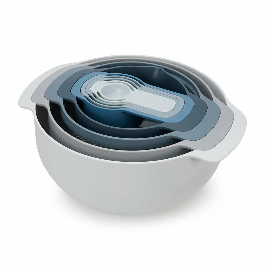 セットはミキシングボウル 4.5L、水きりかご 3L、ふるい 1.65L、ボウル小 0.5Lと5種類の計量カップが付いています/場所を取らないデザインで各パーツをひとまとめに出来ます/ミキシングボウルには滑り止めの底、持ちやすいハンドルがあります/ボウル小には内側にメモリがあり容量を計ることが出来ます/ステンレスのふるいと大きなコランダーもセットされています