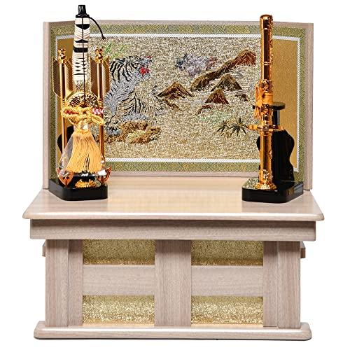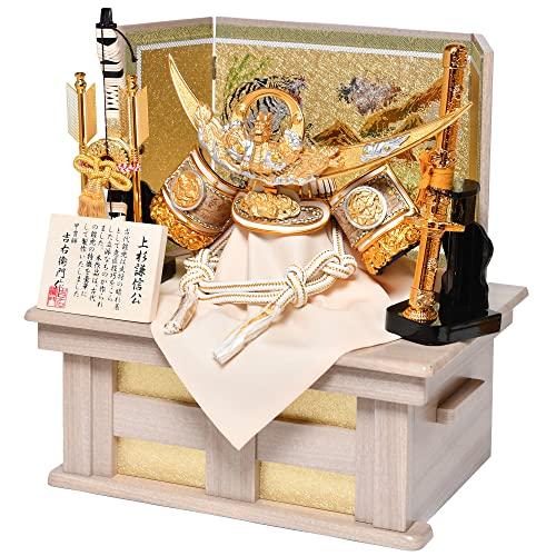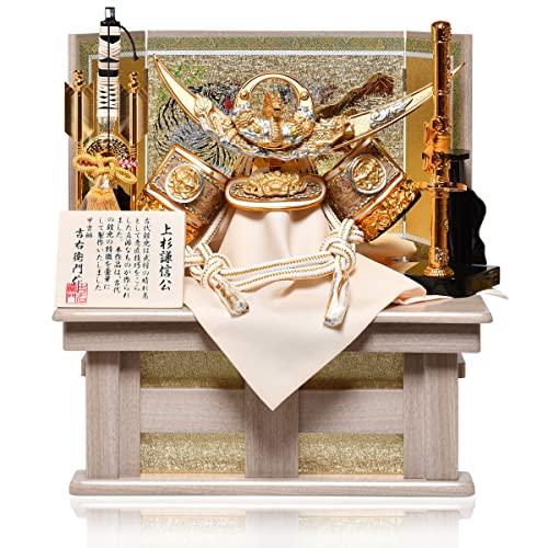 size:間口41×奥行29.5×高さ42.5cm 『金筋白鉢上杉謙信公兜』武将上杉謙信公兜を、白木高床台・猛虎「八方睨みでお子様の成長を見守ります」屏風にセットした歴史と風格を感じさせる作品です。 三日月に日輪前立には運気の上がる昇龍を嵌め、兜吹流返しに竹雀を嵌めて個性美溢れる兜に仕上ました。 金筋白カシュー漆仕上兜鉢、銀小札薄緑・薄ベージュ糸威しと薫風の候を感じさせる仕上がりです。 左右に厄を払う弓と、身を守る刀を配し豪華な雰囲気に。 デザインに優れた収納兜飾りは飾るのに簡単、収納も楽にお手軽に端午の節句を楽しめます。・・・品数限定《税込・送料サービス》 800のみでお届け致します。