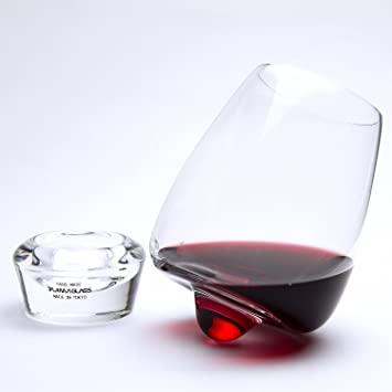 商品名のワインブラーとは、ワイングラスとタンブラーの言葉を掛け合わせた造語です。底部の凸部分のガラスを厚くし、傾けても倒れないように器の肩でバランスをとった意外性あふれる形です。また、凸部分を中心にしたグラスの回転運動がワインのスワリング効果(テイスティングをする時、香りをよく立たせる為に軽くグラスを 回す動作の事)や氷と飲み物のかくはんを容易にするグラスです。