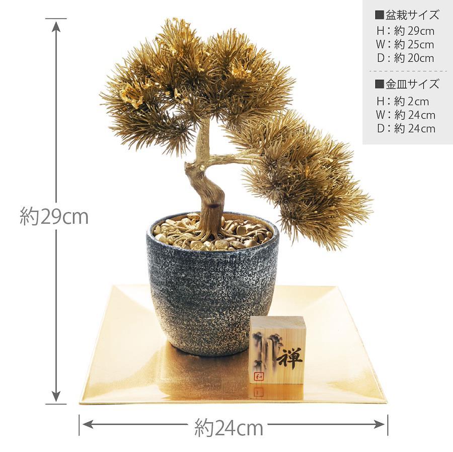 盆栽(松): 金箔加工・合成樹脂製(プラスチック) 花器: 陶器 マルチング: ストーン(砂利) 金皿: 合成樹脂製(ゴールド仕上げ) 盆栽サイズ(鉢を含む): 約H29cm×W25cm×D20cm 金皿: 約H2cm×W24cm×D24cm |
