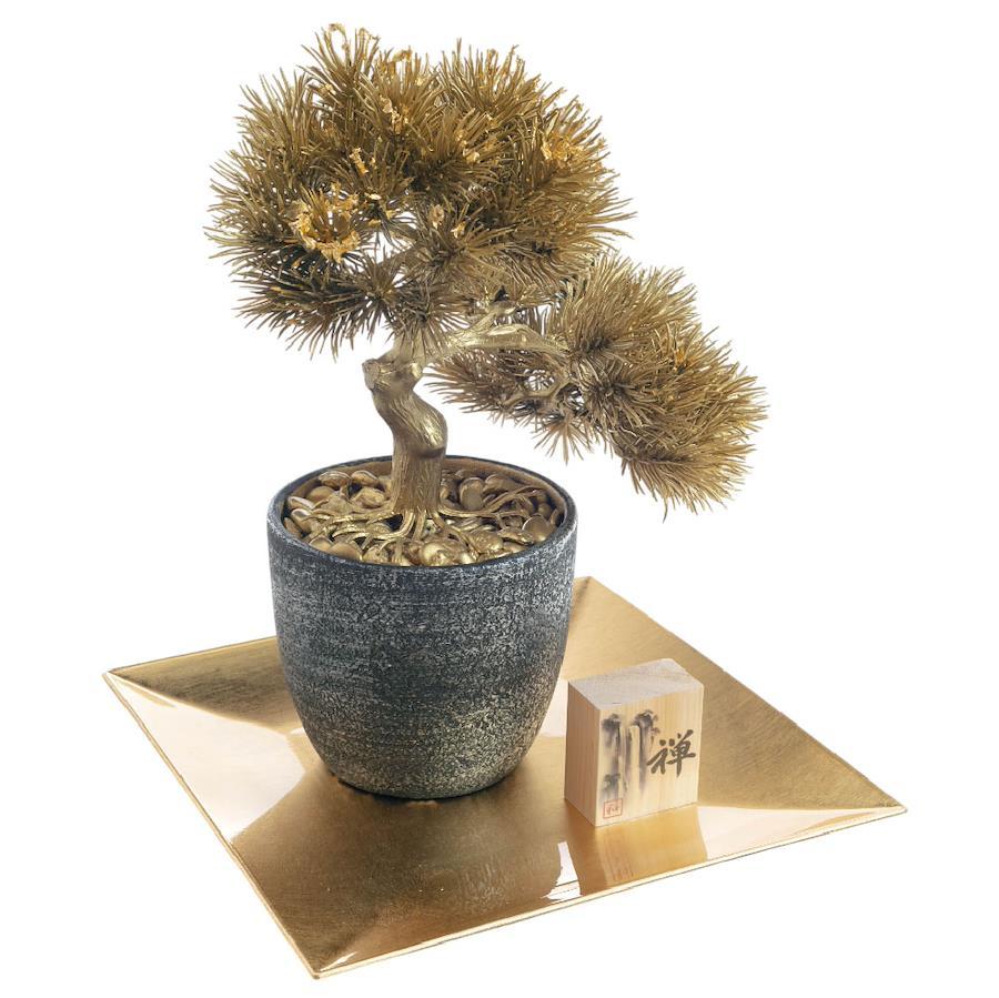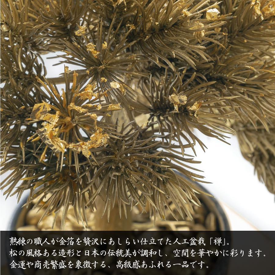 繊細にきらめく金箔と、日本の伝統美を融合させた人工盆栽「禅」。熟練の職人が一つひとつ丁寧に仕立てた逸品で、飾るだけで空間に華やぎと品格をもたらします。樹齢を重ねた松の風格を感じさせる力強い造形に、本物の金箔を贅沢に施した高級感あふれる仕上がり。金運・商売繁盛・財運隆盛の象徴として、和洋問わずあらゆる空間に美しく調和します。空間に、“金運”という名の輝きを。日本の美意識 × 金の力で、富を呼び込む盆栽。