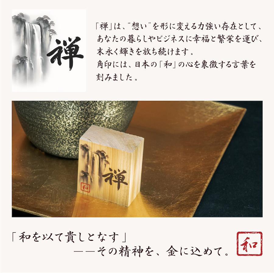 「禅」は、想いを形に変える力強い存在として、あなたの暮らしやビジネスに、幸福と繁栄を運びます。角印には、日本の「和」の心を象徴する言葉を刻印。“和を以て貴しとなす”——その精神を、金に込めて。