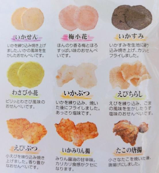 えびせん、いかせん、たこせん等の海の幸がいろいろ9種類入っています。保存に便利なチャック付きです。