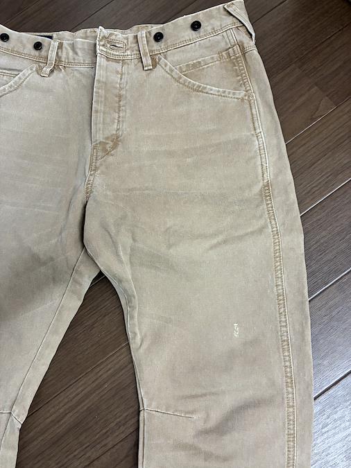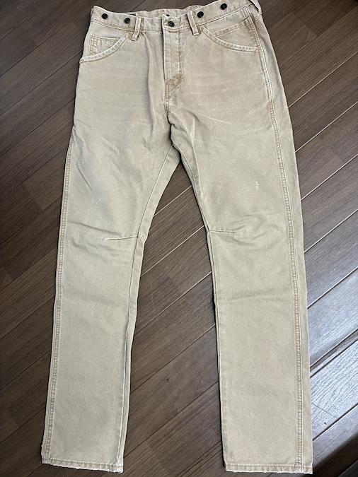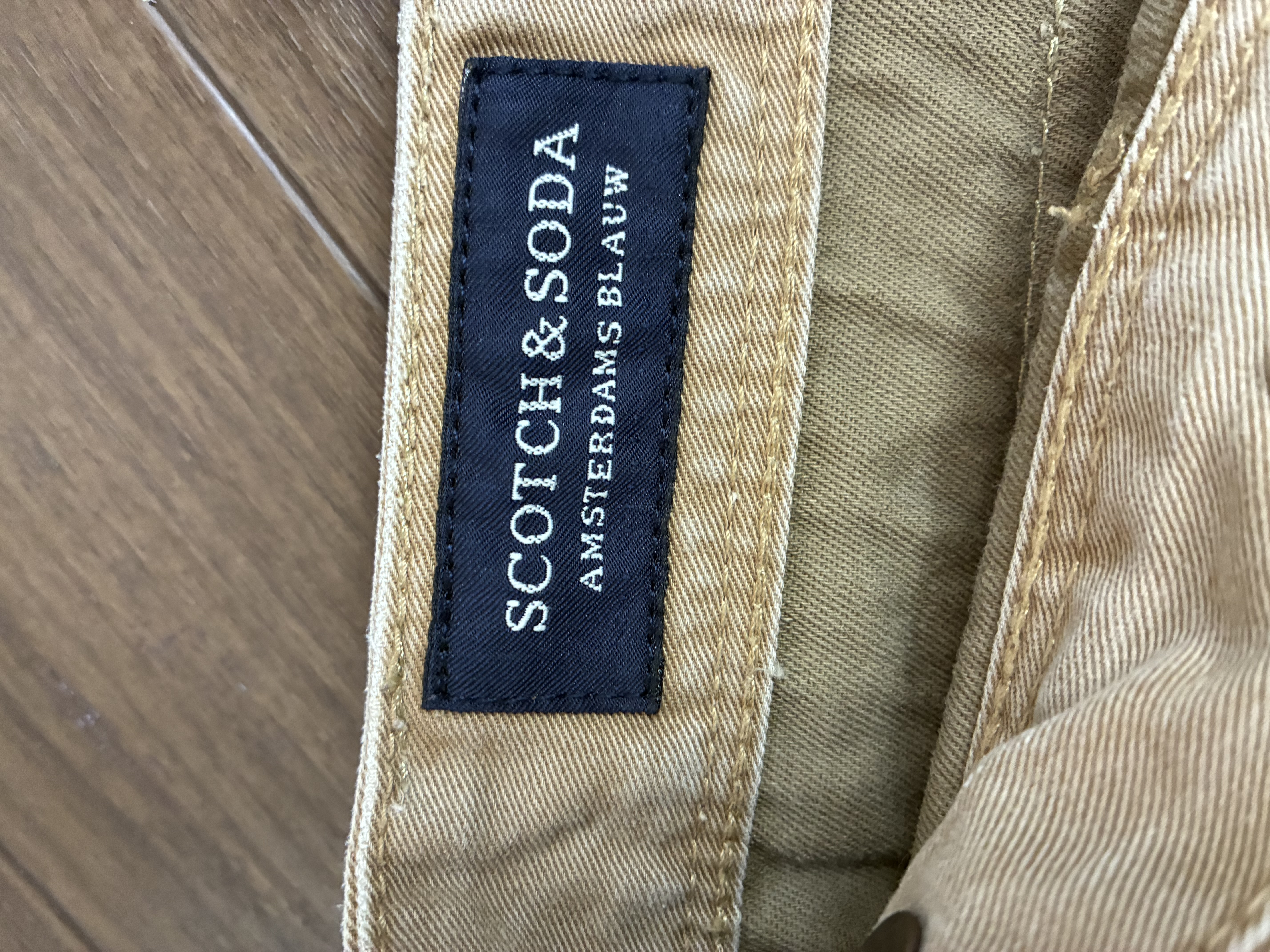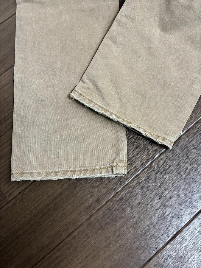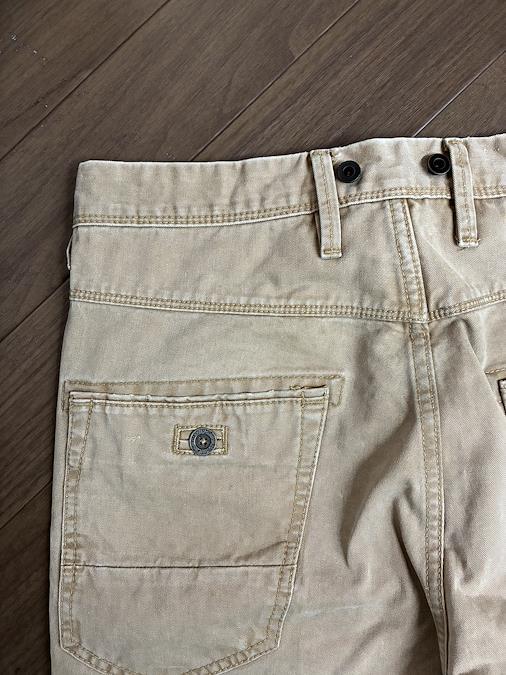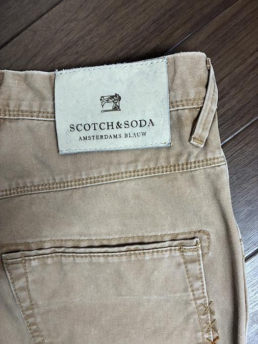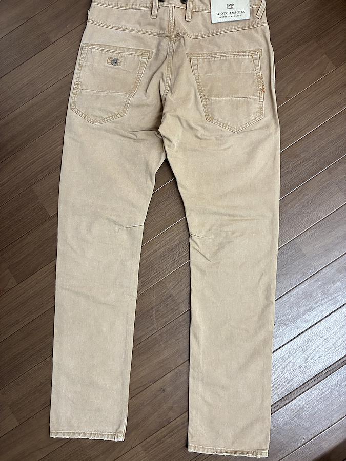 Scotch & Soda のベージュ スリムフィット デニムパンツです。サイズはW30 L32です。ウエストのボタンや裾のダメージ加工、太もものダメージ加工がオシャレで気に入って購入しました。実寸 ウエスト40 総丈104 裾17平置き素人採寸ご了承ください。