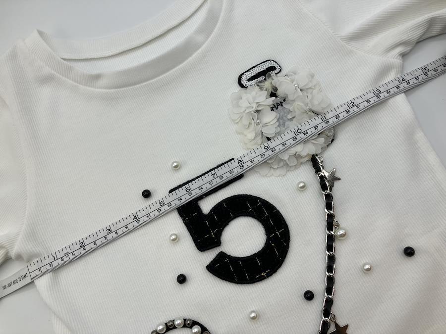 【商品説明】トップスは胸元に立体的なフラワーモチーフやチェーン、パールなどの装飾が施され、韓国系・ガーリースタイルにぴったりなデザインです。ボトムスはスカート風に見えるパンツ型(スカパン)で、動きやすさと可愛さを両立。フロントのゴールドボタンがアクセントになっています。トップスは「HANA」ブランド、中国製、サイズ表記S(実測:着丈約38cm)。スカパンは「DAZY」ブランド、中国製、ポリエステル92%、エラスタン8%、サイズM(実測:着丈約37cm)。
