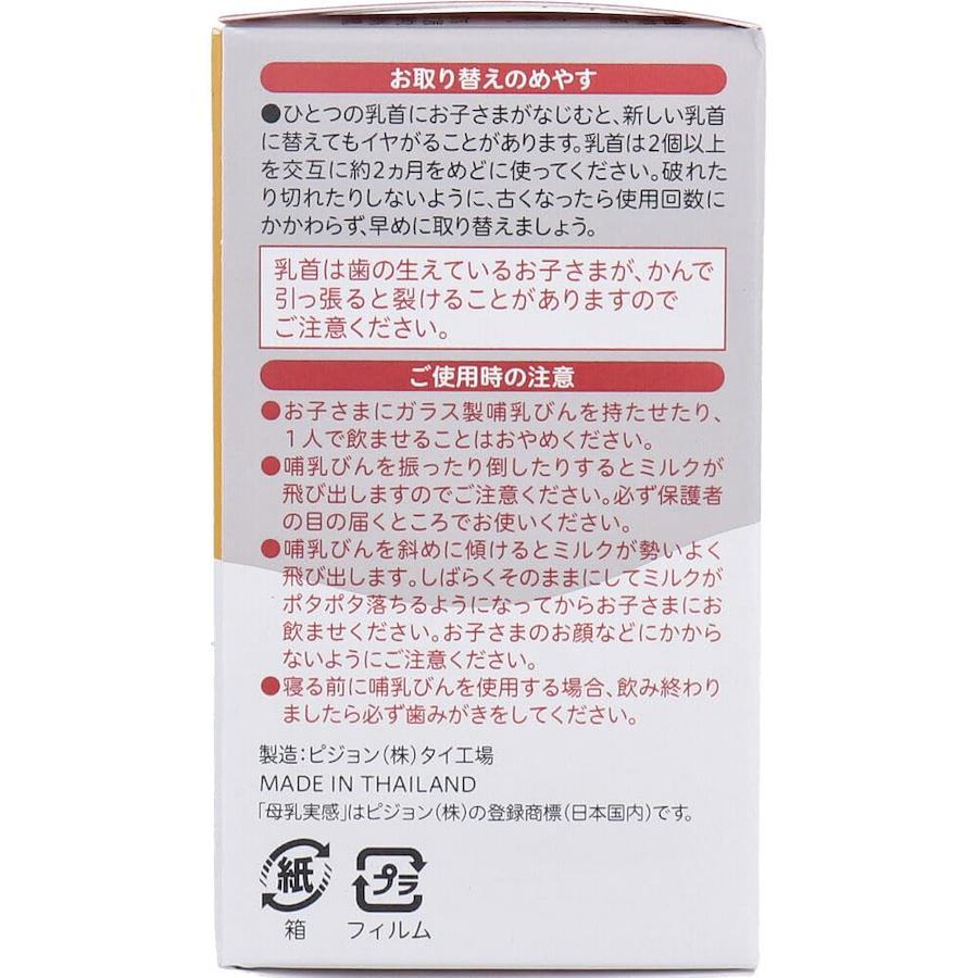 いつでもおっぱいと併用しやすく、安心して母乳育児を続けられます。赤ちゃんの適切な吸着(ラッチオン)となめらかな舌の動きを叶え、母乳育児を心地よくアシストします。●乳首をくわえる深さの目安となる「ラッチオンライン」・赤ちゃんが乳首をくわえる深さの目安となる波型のライン。赤ちゃんにどこまでくわえさせていいのか不安なママとパパのための「くわえる深さ」の目安となるラインです。・この「ラッチオンライン」が、赤ちゃんの適切な吸着(ラッチオン)へ導き、スムーズな授乳をサポートします。●赤ちゃんのなめらかな舌の動きを叶える「やわらかさ」・赤ちゃんにスムーズに飲んでもらうためには、哺乳びんの乳首にもママのおっぱいのような「やわらかさ」が必要です。それを実現するために開発された、母乳実感乳首専用のシリコーンゴムを採用。ママの乳首のやわらかさに、また一歩近づきました。●母乳実感乳首 15ヵ月以上/3L・耐久性にすぐれたシリコーンゴム製。・15ヵ月以上の離乳完了期のお子さまにおすすめの、3Lサイズ(スリーカット)。・哺乳の3原則