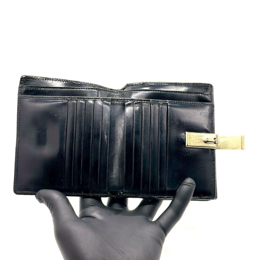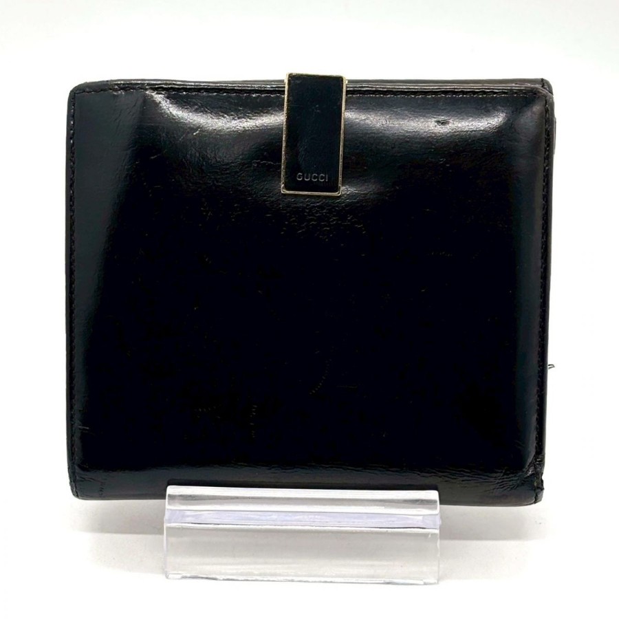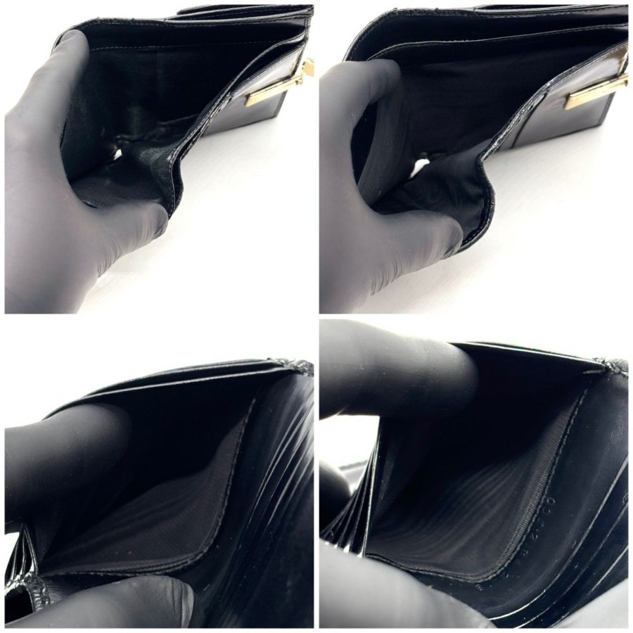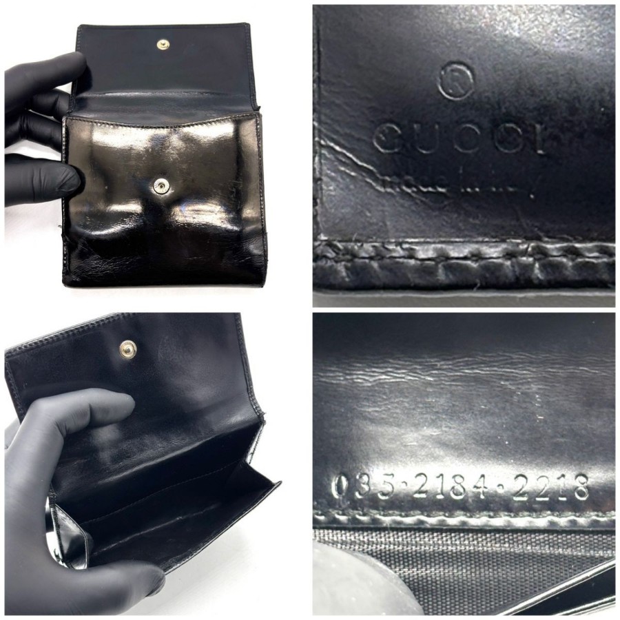 【商品説明】・黒小物を上品に持ちたい方へ。艶感あるパテントレザーと細身クリップが、手元にモードな余韻を添えるGUCCIの二つ折り財布です。10カード収納とコインケース付きで、ミニバッグ派にもデイリー使いにも馴染む一品です。