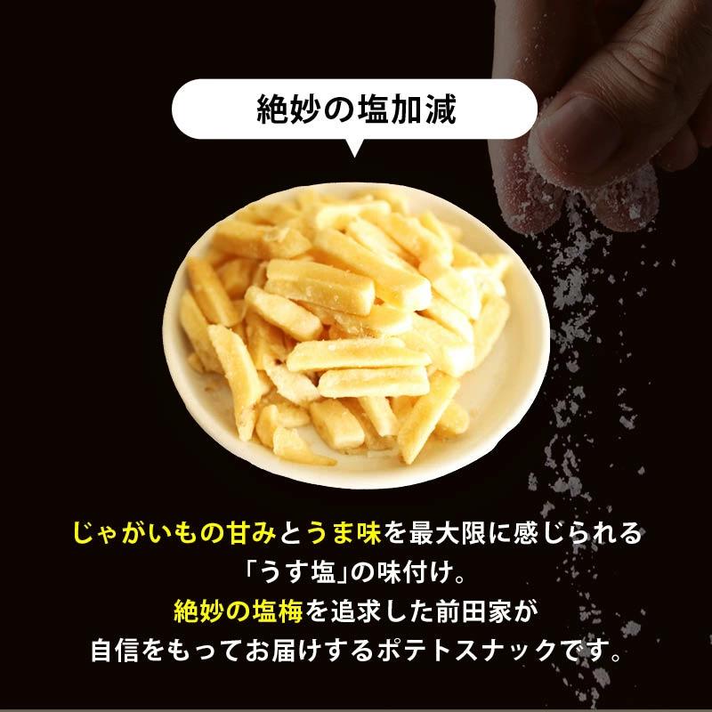 【絶妙の塩加減】じゃがいもの甘みとうま味を最大限に感じられる「うす塩」の味付け。絶妙の塩梅を追求した前田家が自信をもってお届けするポテトスナックです。