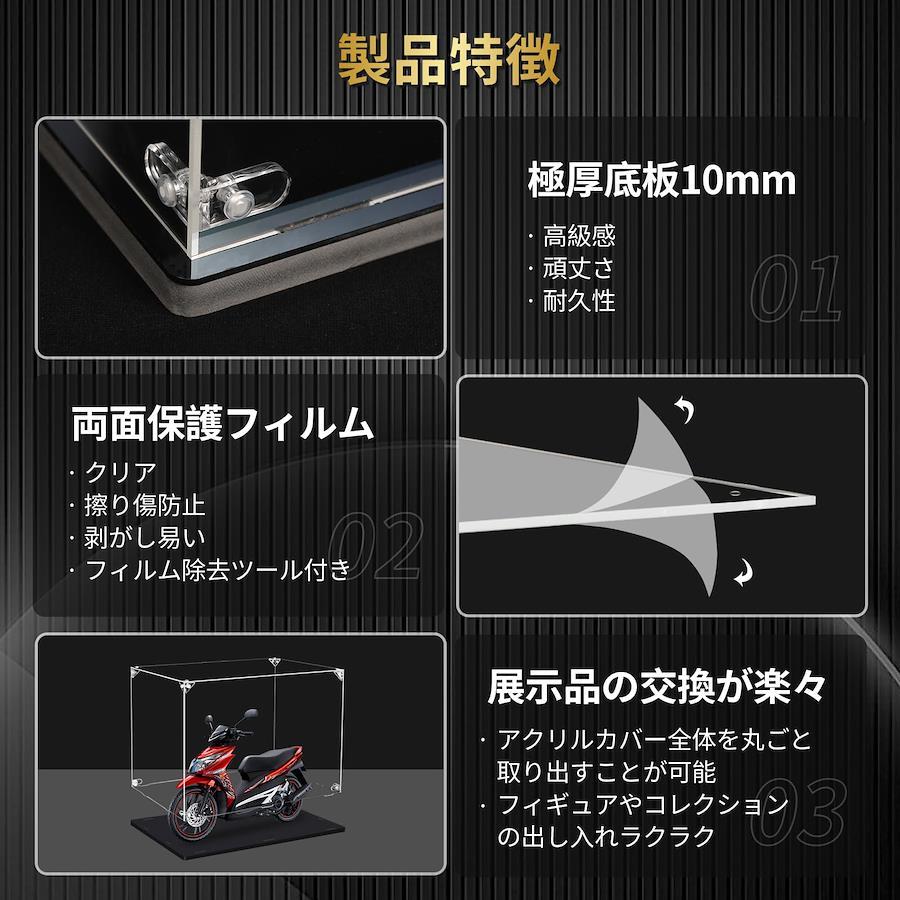 【安定で頑丈な構造】新しい世代のアクリル フィギュアケース が登場!独特な高強度の三角形接続構造デザインを採用し、物理的な構造で組み立てるため、接続部品を押さえるだけで簡単に組み立てることができます。厚さ10ミリの底板を採用し、同じサイズのケースを重ねて収納することも可能です。また、優れた5キログラムの耐荷重能力を備えており、衝突が起きても崩れにくく、展示ケースも倒れにくいため、大切なフィギュアを保護するのに最適で、安心して使用できます。 【高い透明度】コレクションケース は、uvカットの高透明度のアクリル素材を使用しており、黄ばみの紫外線の影響を防止します。クリアで透明度の高い仕上がりで、透光率は95%に達し、耐久性に優れ、ガラスに匹敵する透明度を持ちながらも軽量で破損しにくいです。剥離しやすい保護フィルムを使用しており、埃や傷から重要なアイテムを美しく清潔に保つことができます。展示品を360度から鑑賞することができます。 【選べる650サイズ】当店の フィギュアケース は650サイズを選ぶことができます。フィギュアのサイズや数量、デコレーション方法、設置場所に合わせて自由にサイズを選択できます。どんなサイズのコレクションアイテムでも完璧に収納し、美しく展示することができます。注意:サイズを測定してからご注文ください。 【商品仕様と用途】サイズ:幅30cm×奥行20cm×高さ20cm / 素材:トップパネル(透明)、サイドパネル×4(透明)、ベース(黒)、接続部品(透明)。付属品:組み立て説明書、防汚手袋、清掃布、アクリル円板。用途:コレクションアイテムの収納、アクリルケース、ディスプレイケース、プラモデルケース、透明ケース、模型、船、人形、展示ケース、フィギュアモデル、埃や汚れから重要な展示品を保護し、いつでも美しい状態を保つことができます。 【アフターサービス・商品の詳細・30日間の保証】ご購入日から30日間、メーカーのサポートが付属しています。商品に破損などの問題が発生した場合は、コメントする前に当社にご連絡ください。無料の交換や返金サービスを提供いたします。お客様にご満足いただけるよう全力で対応いたします。わからないことがあれば、いつでもでお問い合わせください。