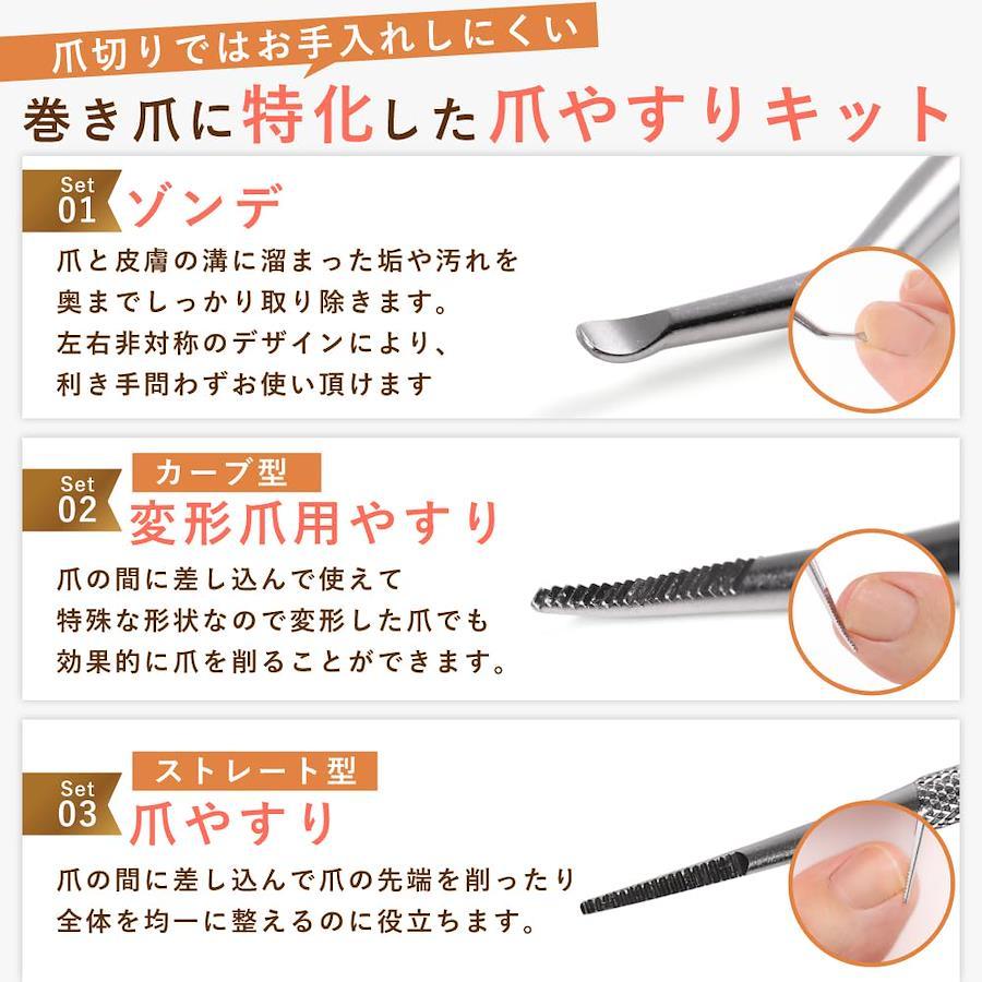 これ一つで巻き爪ケアは充分!という4点セットをご用意致しました。このセットには爪垢取りと爪やすり、巻き爪用テープが含まれており、特に巻き爪を持つ方々に有効なケアを提供します。 日常的に靴を履いているため、爪垢は湿度が高い環境にあり放っておくとさらに真菌が増殖して爪のトラブルやカビの原因になります。 独自のカーブ設計、先端極薄なので爪のトラブル、匂いの根源を綺麗に取り除くことができます。爪やすりは、巻き爪に特化した設計で、食い込んでいる部分や全体の形を整えることができます。両端にはカーブとストレートの2種類があり、多様な爪の形状に適応します。 アレルギーに優しい高級ステンレス製を起用しています。滑り止め加工も施されていて水洗いOKで衛生的、清潔に保てます。「清潔に保管したい」というお声から、専用ケースをお付けしました。紛失防止や旅行先への携帯性に役立ち、一生モノとして大切に使用できます。 万が一商品に不良がある場合は交換・返品に対応させていただきます