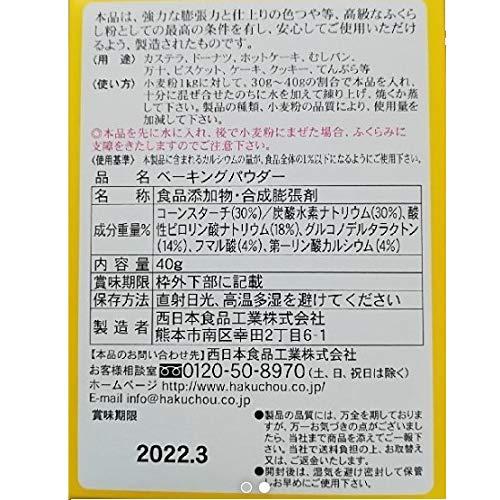 本品は、強力な膨張力と仕上りの色つや等、高級なふくらし粉として最高の条件を有し、安心してご使用いただけるよう、製造されたものです。 カステラ、ドーナツ、ホットケーキ、むしパン、万十、ビスケット、ケーキ、クッキー、てんぷら等に。 小麦粉1kgに対して、30g~40gの割合で本品を入れ、十分に混ぜ合せたのちに水を加えて練り上げ、 焼くか蒸して下さい。製品の種類、小麦粉の品質により、使用量を加減して下さい。 ご注意(免責)>必ずお読みください 本品を先に水に入れ、後で小麦粉にまぜた場合、ふくらみに支障をきたしますのでご注意下さい。【重要】メーカーによる商品リニューアルに伴いパッケージ(内容量も含む)変更が行われた場合、新パッケージでお届け致します事ご了承願います。